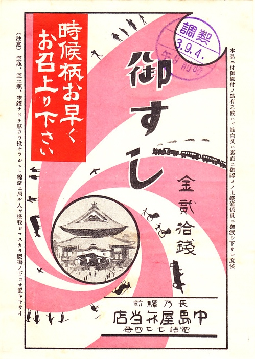 1928(昭和3)年9月4日の調製と思われる、昔の長野駅弁の掛紙。善光寺に牛も人も汽車も人力車も自動車も吸い込まれていくような絵柄。