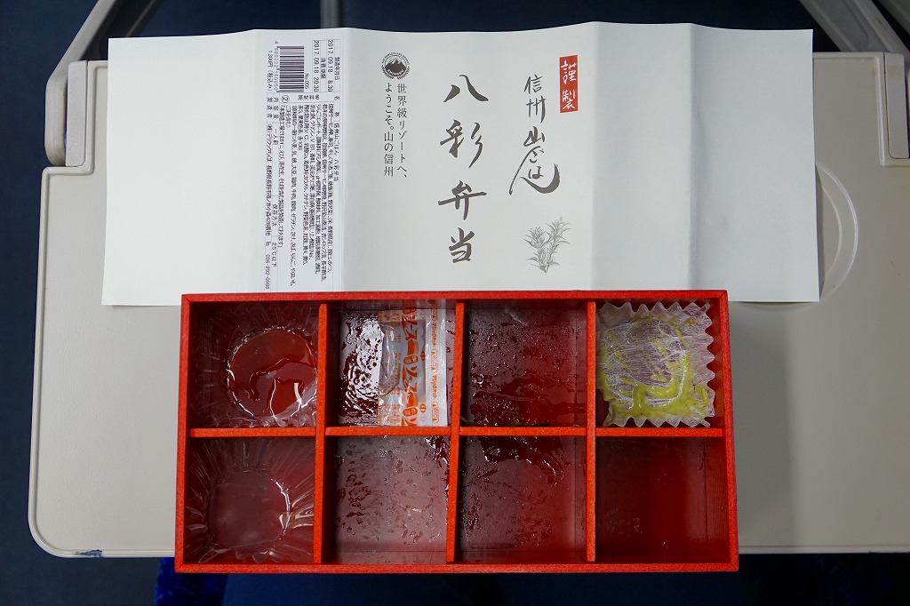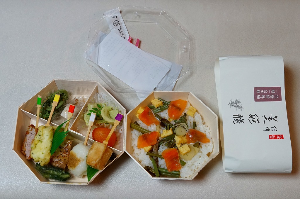 2017(平成29)年7月から9月までのJRグループの観光キャンペーン「信州デスティネーションキャンペーン」の開催に合わせ、その期間中に販売された。8区画の中身は、梅と野沢菜の俵むすび、信州サーモン押し寿司、信州産牛の時雨煮の御飯、信州サーモン味噌焼と厚焼き玉子、信州ポークカツ、タケノコの木の芽味噌和え、野沢菜のわさび漬けとナガイモの酢漬け、りんごのコンポートとあんずシロップ。よくあるタイプのなんでもまるごと駅弁も、見た目が美しく、味もまた美しく。