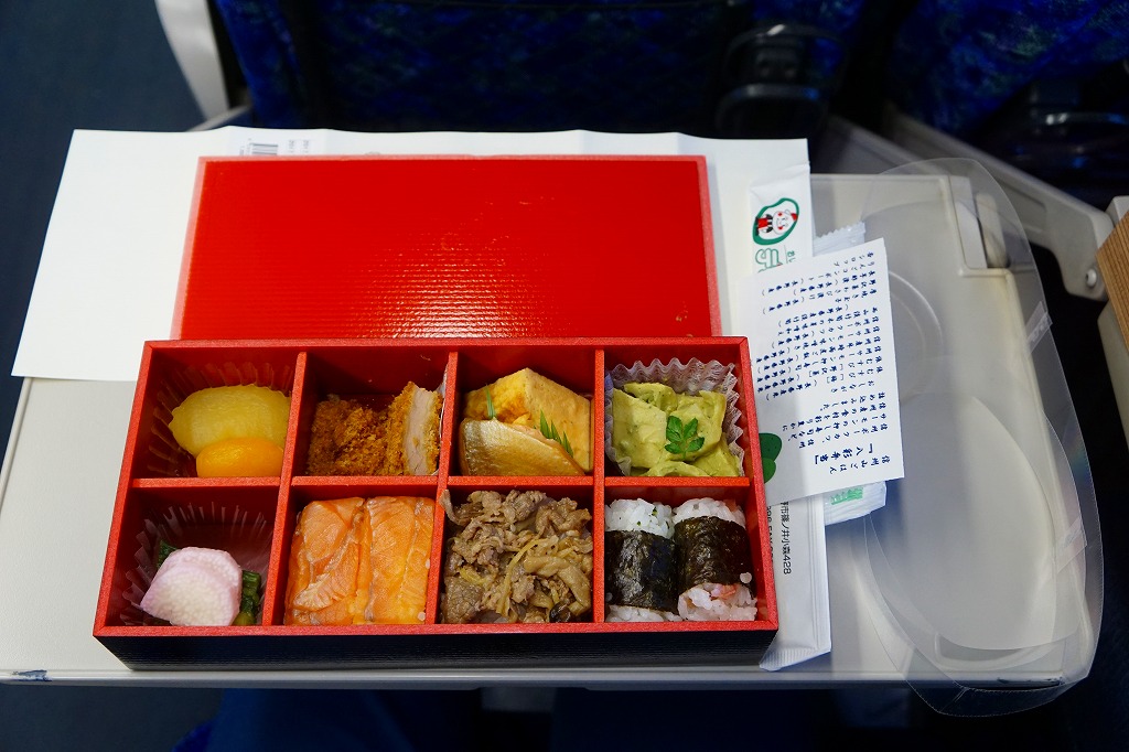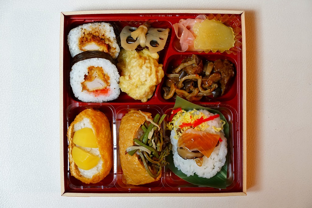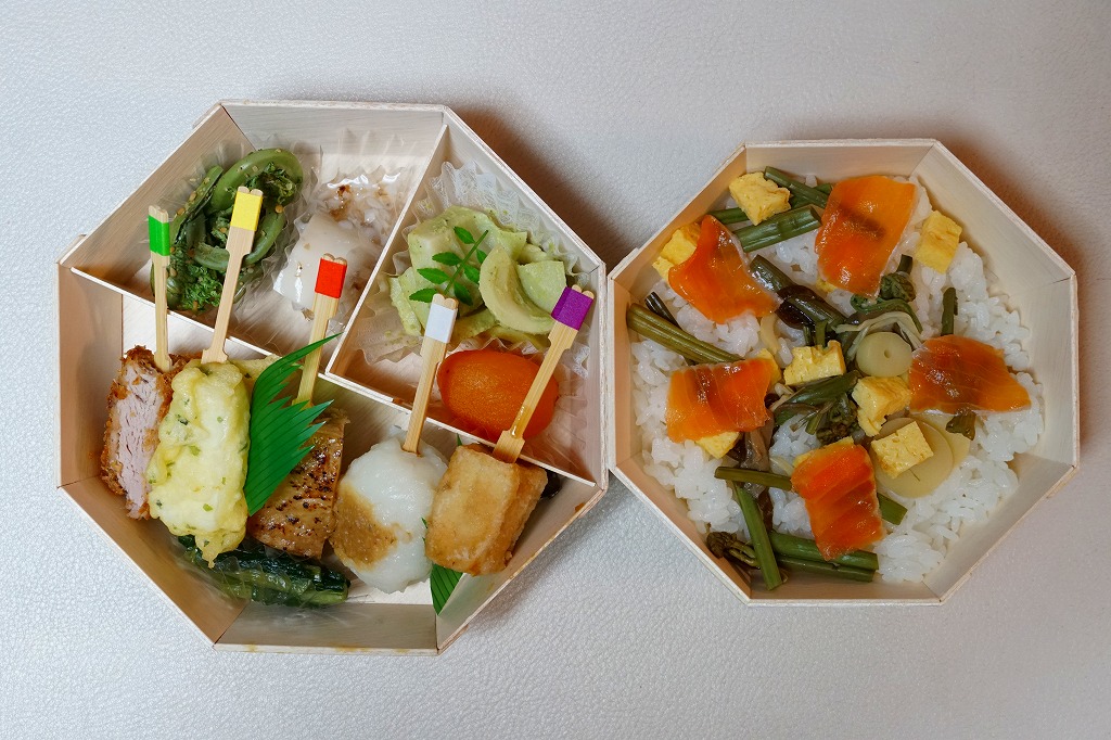 長野の善光寺の御開帳などの際に前立本尊(まえだちほんぞん)と結ばれる「善の綱」と重ね合わせたという中身は、上の「一の段」に上段に5種の串やゼンマイやタケノコなど、下の「二の段」にサーモンと山菜のちらしずし。これは美しいお弁当で、その見た目と同じくらい、味も上品。価格は2015年の発売時で1,100円、2023年時点で1,300円、2024年10月時点で1,600円。