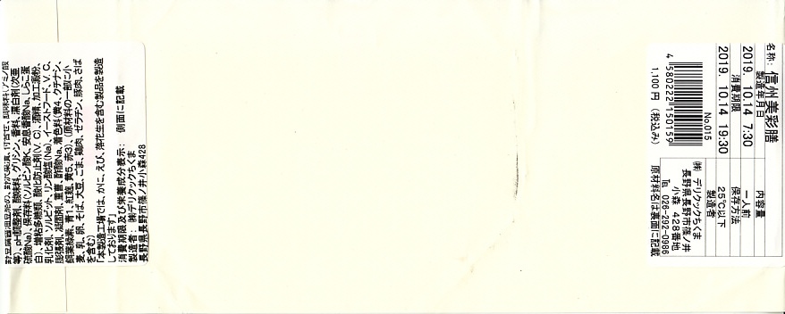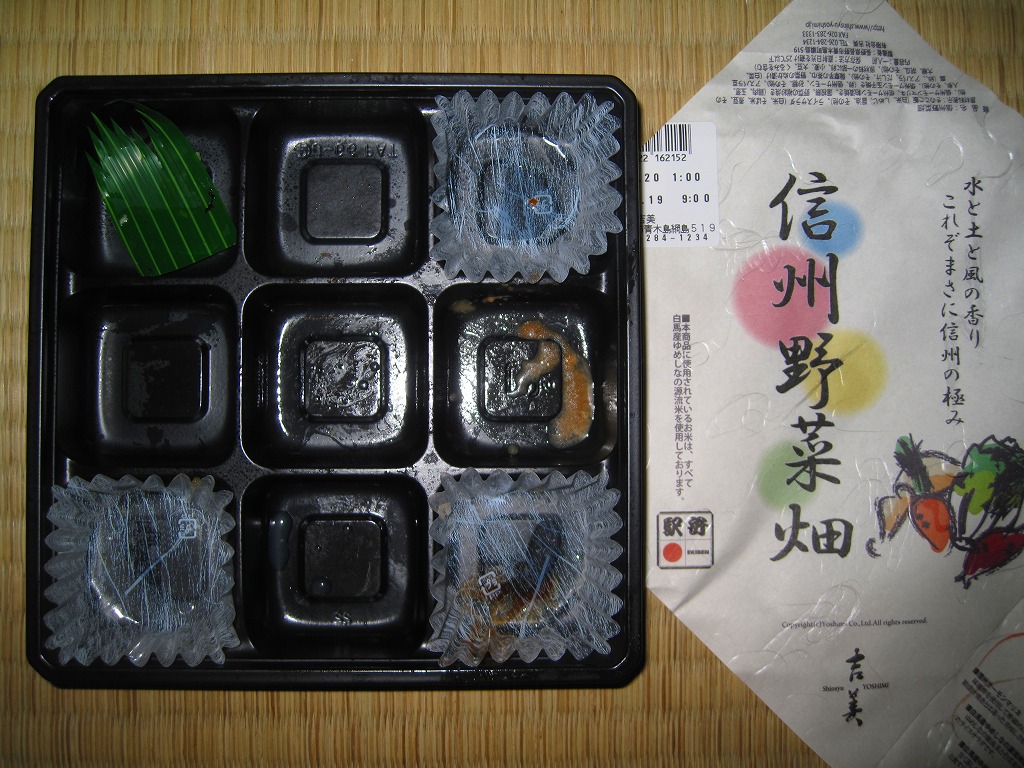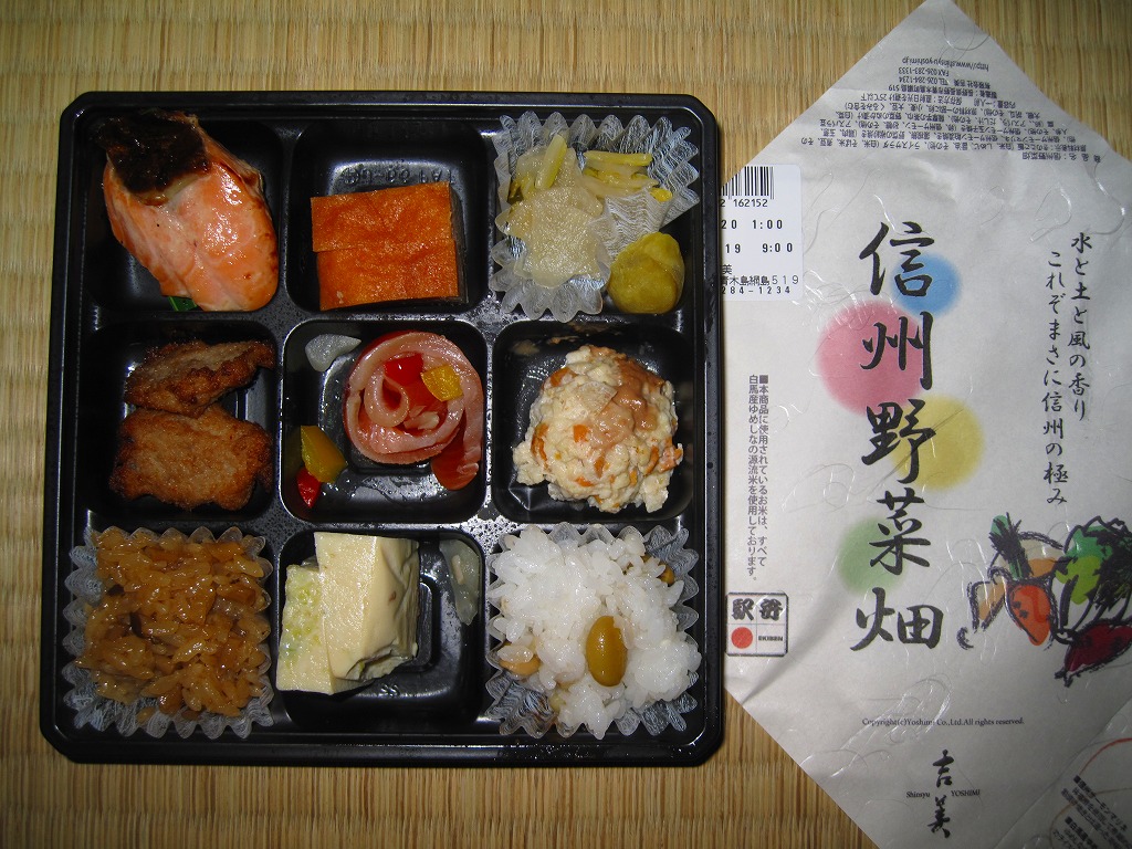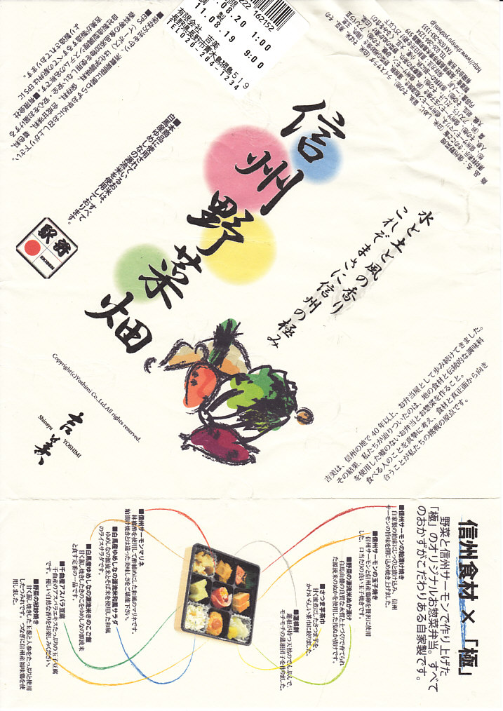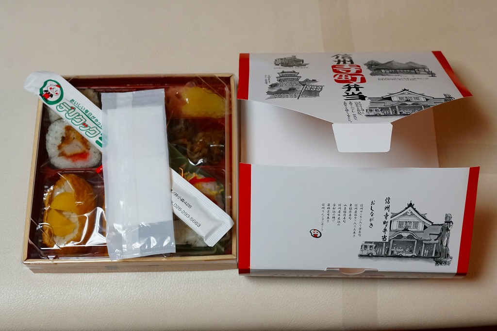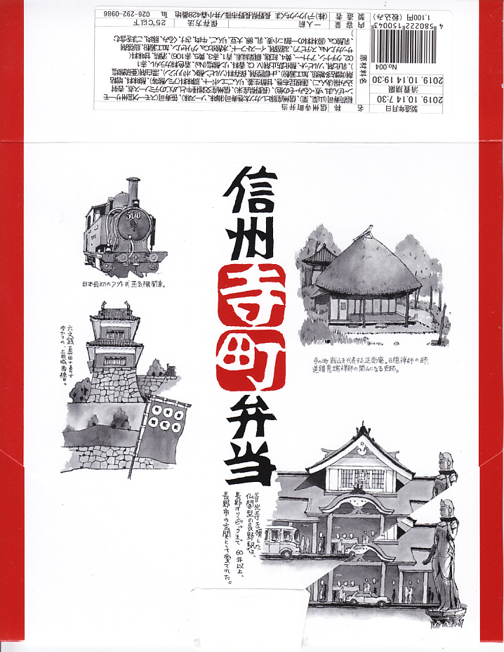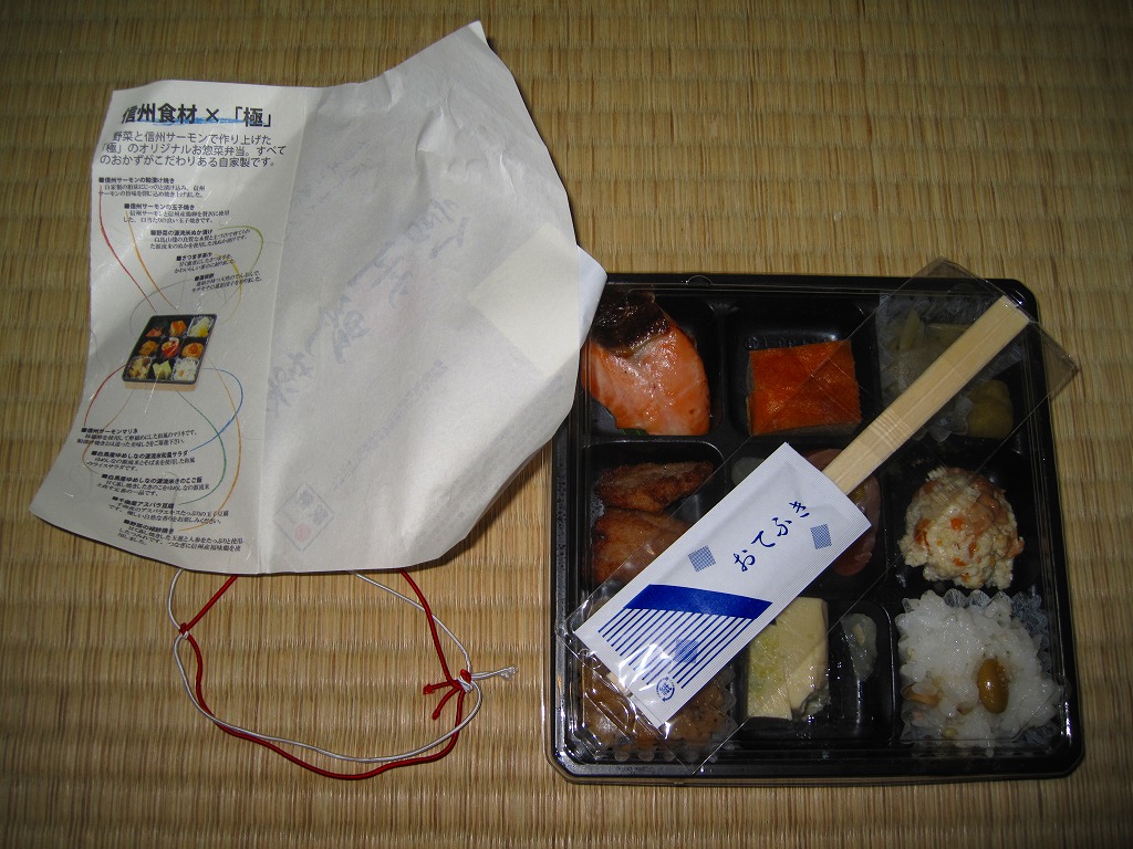 長野駅は1997年10月の長野新幹線開業に伴い、善光寺を模した重厚な駅舎が取り壊されて変哲のない橋上駅に変えられたが、駅弁には山の田舎の雰囲気が見た目で残るものが多いと思う。簡素以上過剰以下な包装がその雰囲気を出す。