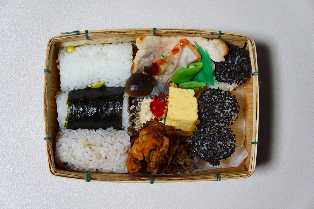 透明なふたをした竹皮編み容器の中で、白いシートを介して置かれる中身は、海苔巻、十穀米、豆御飯の俵飯各1本、白米と黒ゴマの俵飯3本、鶏唐揚、豚焼き、焼サケ、玉子焼、梅干し、わさび漬けなど。つまりだいたい、おにぎり駅弁。どこが信州や長野なのかは分からないが、俵飯の色と形と配置に、おしゃれなつくりを感じた。