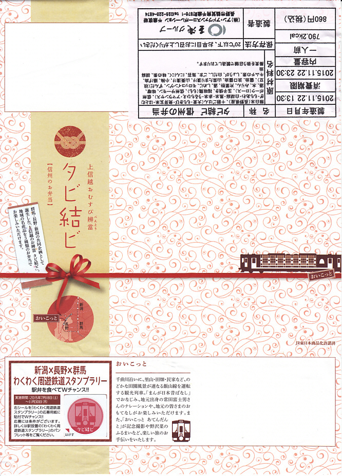 JR東日本の新潟・長野・高崎の3支社合同の販売促進企画の一環で、2015(平成27)年7月18日から11月30日まで、新潟県の上越妙高駅、長野県の長野駅、群馬県の高崎駅で、同じ名前と容器と価格に異なる内容で販売される期間限定駅弁。これは長野駅版。