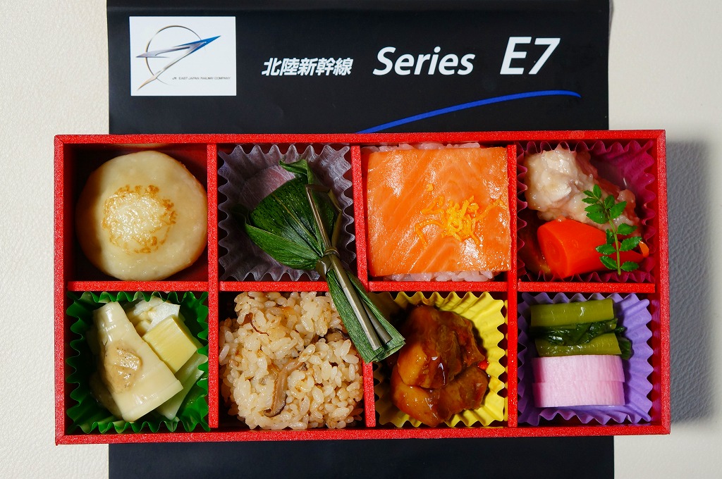 北陸新幹線は2015(平成27)年3月14日に開業。正しくは、北陸新幹線の高崎駅から長野駅までの間は、1997(平成9)年10月に開業していたものの、北陸地方に達していないため駅や時刻表では「長野新幹線」と呼び、これが長野駅から金沢駅までの開業で呼び名と公式な名前を合わせたもの。この延伸開業に向けて、JR東日本E7系電車とJR西日本W7系電車を製造した。E7系は金沢駅までの開業を前に、2014(平成26)年3月14日のダイヤ改正で東京駅と長野駅を結ぶ「あさま」一部列車で営業運転を開始、その日からいわゆる北陸新幹線の開業までが、この駅弁の販売期間であった。