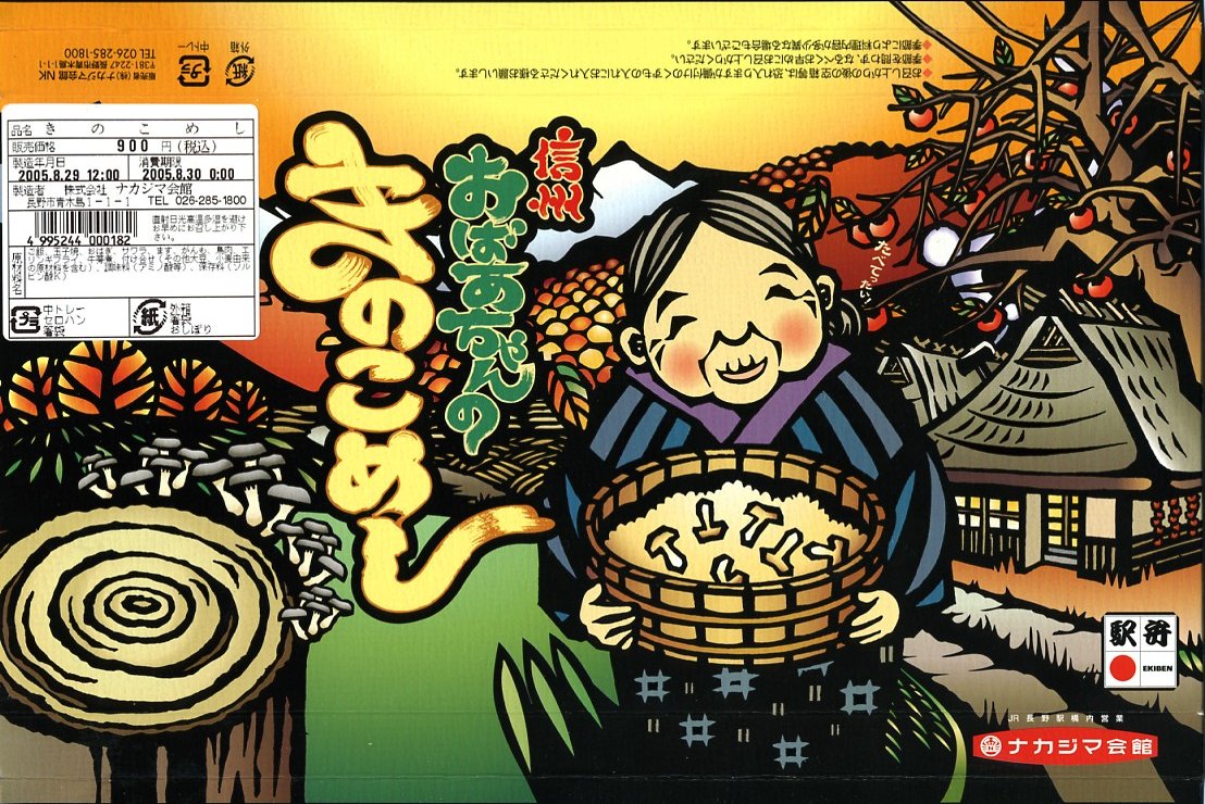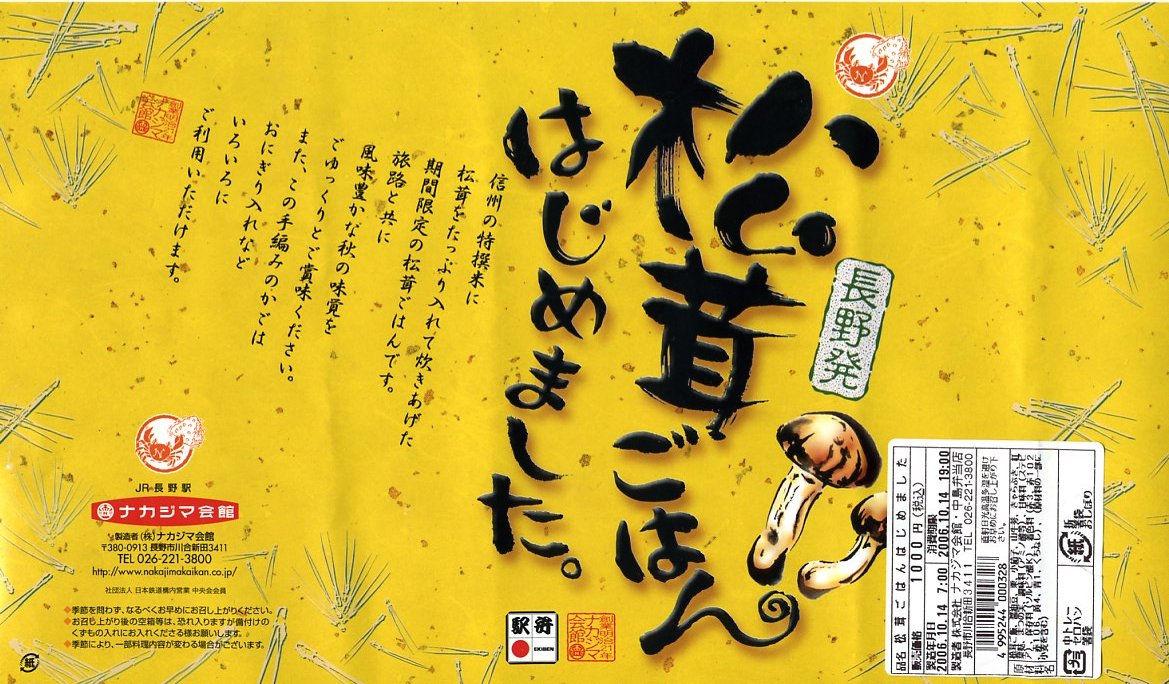 2004(平成16)年の秋に発売か。長野駅の他の駅弁でも使われる、小柄で細長い竹編み容器に割りばしなどを置き、商品名と宣伝文を描いた黄色い掛紙で巻いて、紙ひもでしばる。竹皮柄の紙に包まれた中身は、松の実混じりの松茸御飯に醤油豆や小ナスなど。