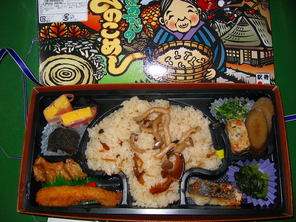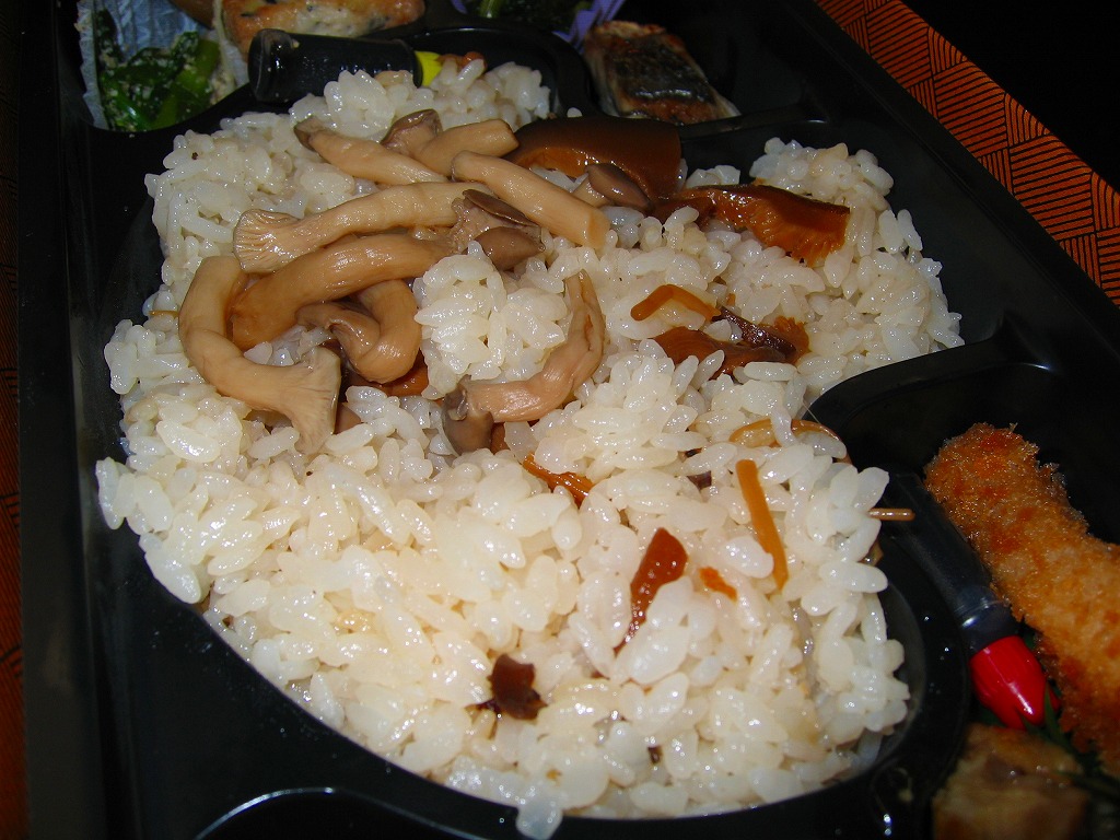 松茸は薄く小さいのが3切れしか入らず、見栄えでは一瞬ガッカリするものの、松茸御飯そのものの豊かな香りと柔らかな食感は、なかなかのもの。販売期間は秋季限定、というより10月限定ではないかと思われるが、調製元が駅弁を含む食品事業から撤退したため、今後に販売されることはない。