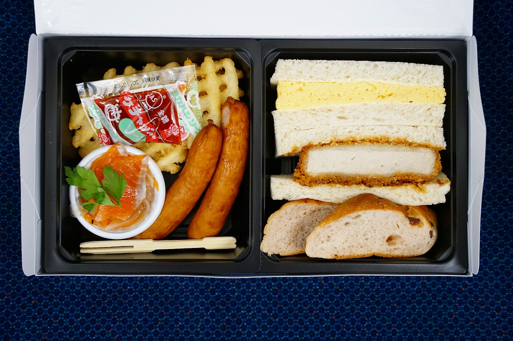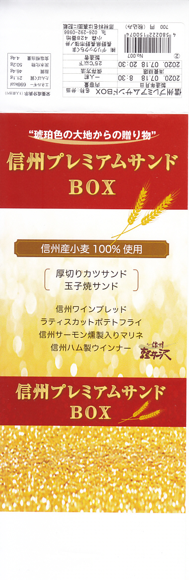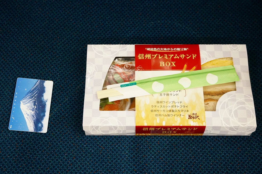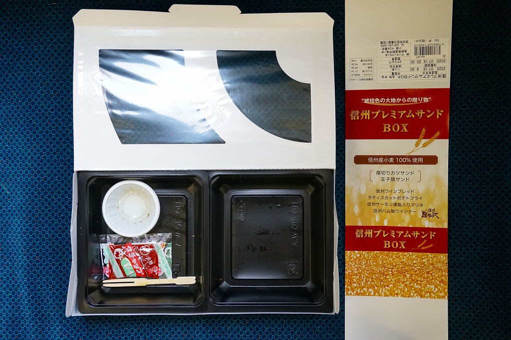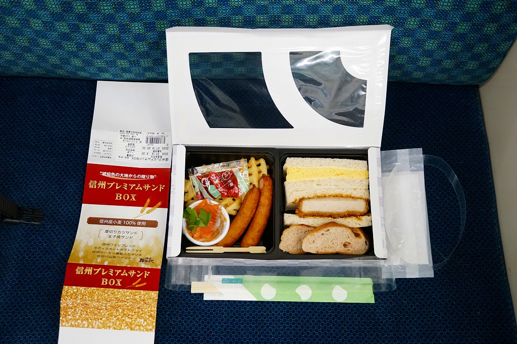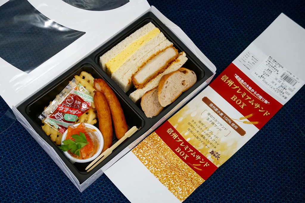 2019(令和元)年の7月までに発売か。同年のJR東日本の駅弁キャンペーン「駅弁味の陣2019」へ新作駅弁としてエントリー。近年は駅弁ではほとんど見られなくなった、おかずを入れたサンドイッチ。窓から中が見える紙箱には、おしながきを兼ねた掛紙を巻く。中身は厚切りカツサンドと玉子焼サンドが各1切れと信州ワインブレッド、ラティスカットという網目模様のポテトフライ、信州サーモン燻製入りマリネ、信州ハム製ウインナー2本。値段と分量の設定が難しそうだが、駅弁が多様性を失わないよう、こんな創作があってよい。価格は2020年の購入時で700円、2023年時点で800円、2024年10月時点で900円。