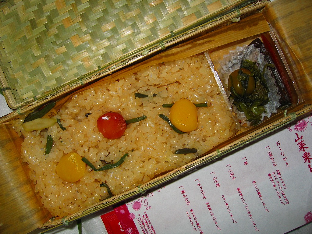 2003(平成15)年に発売か。細長い竹編み容器に割り箸を載せて、商品名を記した朱色の掛紙を巻き、紙ひもで十字にしばる。ふたを開けると緑色のお品書きが登場。中身はタケノコ御飯に焼きタケノコを載せて、ニシンとタケノコの旨煮、タケノコの味噌挟み、タケノコの魚すり身巻き揚げなど、おかずにもタケノコをいろいろ使い、醤油豆を添える。