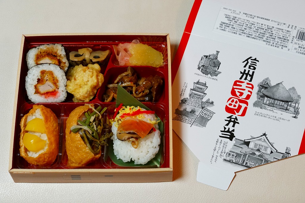 2008(平成20)年11月1日の発売。白いパッケージには、長野駅の旧駅舎、飯山の正受庵、上田城、横川駅〜軽井沢駅のアプト式蒸気機関車を描く。中身は栗入りいなり、山菜入りいなり、梅味とソース味のとんかつ巻き各1個、丸々太ったサーモン笹寿司、シメジと牛肉の炒め物、りんごのコンポートなど。他の駅弁で見ないものを、多種で雑然のはずがていねいに収める。いろんなものを味わえた気分になる、真のなんでもまるごと弁当。価格は2010年時点で1,000円、2016年時点で1,100円、2023年時点で1,250円、2024年10月時点で1,400円。