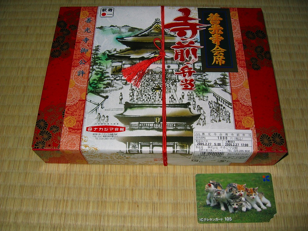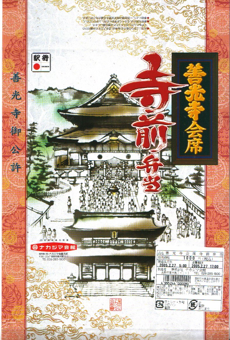 善光寺は、江戸時代は伊勢に次ぐ観光地で今も長野市街最大の名所。7年に一度つまり6年ごとの御開帳は約2か月で数百万人もの参拝客を集める。この駅弁も2003年4月から5月までの御開帳に向けてリニューアルされたのだろう。掛紙に描かれる国宝の本堂は観光写真でも正面から撮られるが、その幅や高さの約2倍もある奥行きこそ注目すべきだと思う。