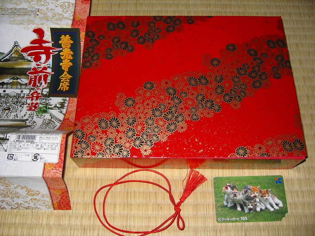 2002(平成14)年11月のリニューアル。赤い豪華絢爛な感じの柄を持つ長方形の容器に善光寺を描いた掛紙をかけてゴムひもでしばる。中身は精進料理になっており、湯葉フライや山芋磯部揚、鮭リンゴ焼揚や山菜、胡麻豆腐や黒米むし、織部ごはんとはすの実ごはんなど全16品。そのコンセプトによりおかずに困る感じもするが、見た目や善光寺御公許という立場を裏切らない風味と品質の良さがあり、これが千円ならお買い得。