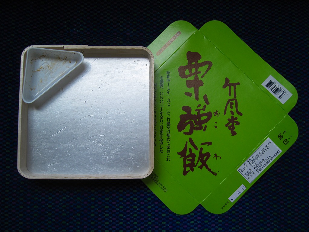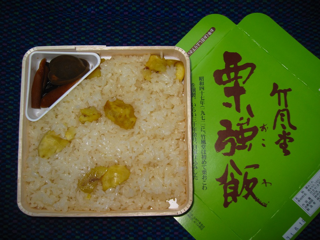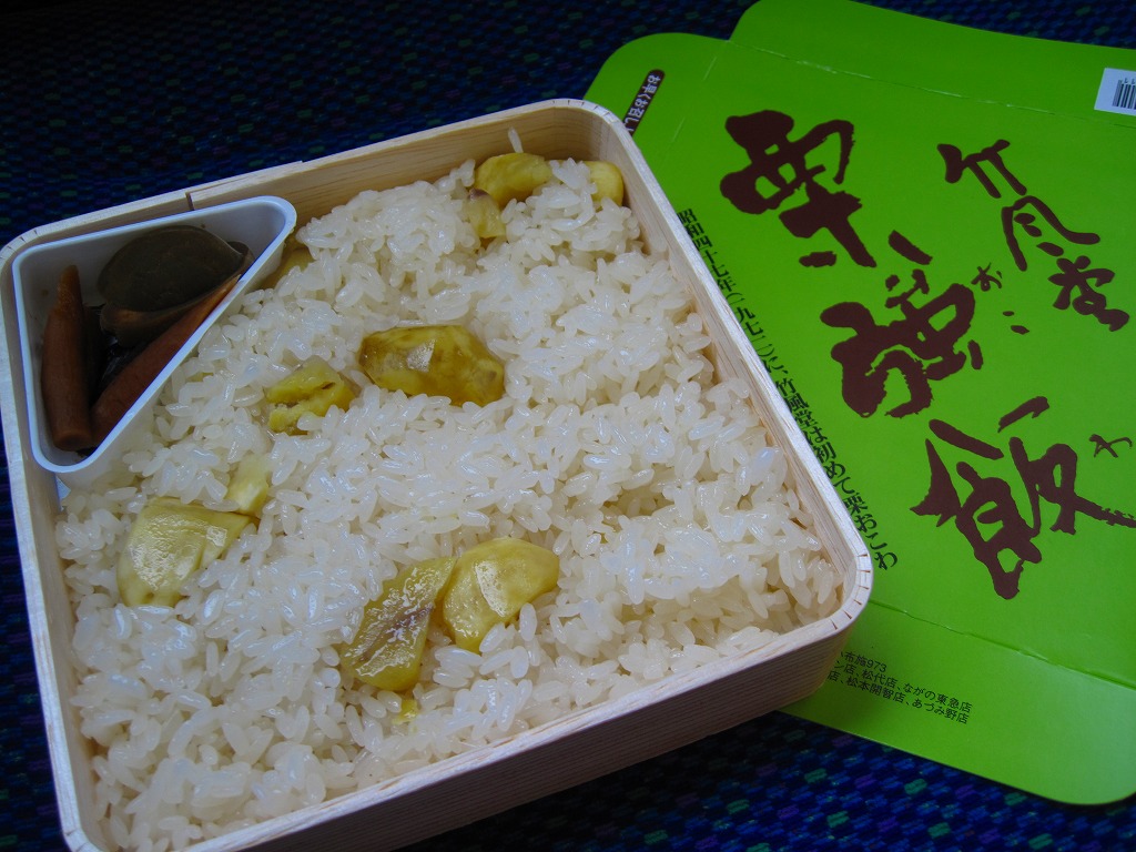 いつから駅売りされているかは分からないが、商品としては1972(昭和47)年に発売したそうな。中身は商品名のとおり、栗おこわに漬物を添えるだけという自信作。見た目に素朴で上品だが、甘味がちょっと強かったような。調製元の竹風堂(ちくふうどう)は小布施で老舗の栗菓子屋。同じものが直営店で売られており、これは駅弁ではなく郷土の名物である。