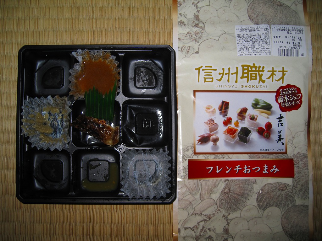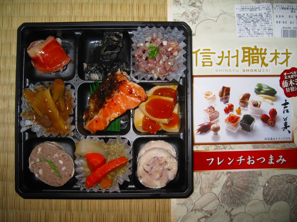 駅弁の名前のとおり、ビールではなくワインに合うべき9区画のおつまみであり、長野駅弁で見たゆで卵と前者に入る焼鮭でようやく駅弁を思い出すもの。今までの長野駅弁は少々野暮ったいところがあったが、この路線がヒットすればリゾートや高原の地域性が結び付くと思った。調製元の破産により、2012年3月30日までに終売。