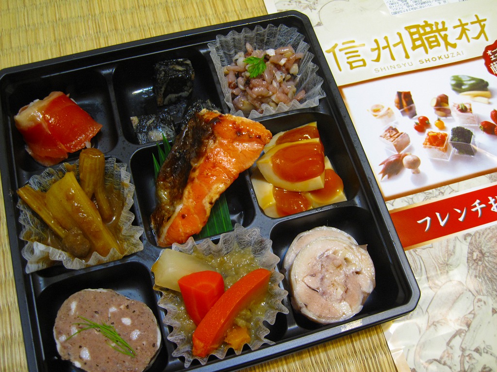 中身は左上から時計回りに「信州サーモンのオモニエール」「信州アルプス牛煮込みイカ墨の香り」「古代米、そば米、キノコのライスサラダ」「半熟玉子味付き薫製」「信州産福味鶏のガランティーヌ(洋風肉巻き)」、「信州産茄子のコンフィと冷製薫製野菜」「信州産鹿のテリーヌ」「セロリと信州産鹿のシチュー」で、真ん中に「信州サーモンの吟醸炭火焼」。