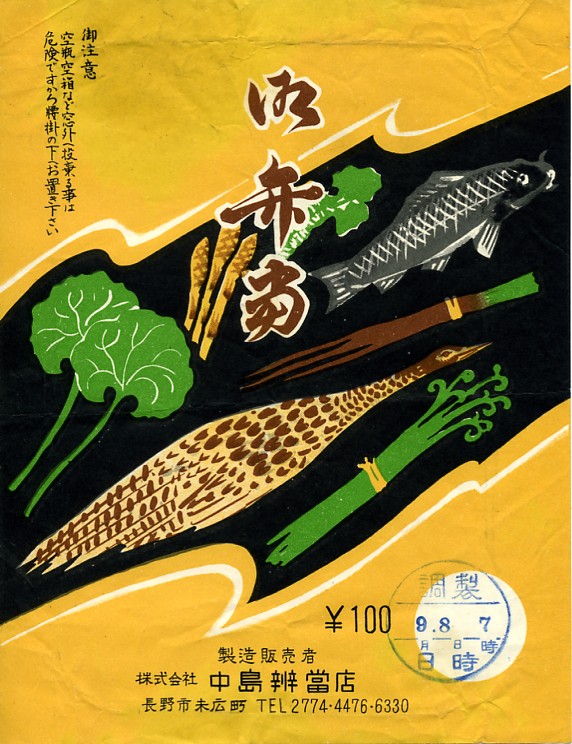 1950年代、昭和30年前後のものと思われる、昔の長野駅弁の掛紙。長野市に市内局番ができる1960(昭和35)年頃より前のものだろう。地域の名産と思われる食材が7点ほど描かれる。上の御飯の掛紙とセット品かと思ったが、電話番号の桁数が異なるので、そうではないようだ。
