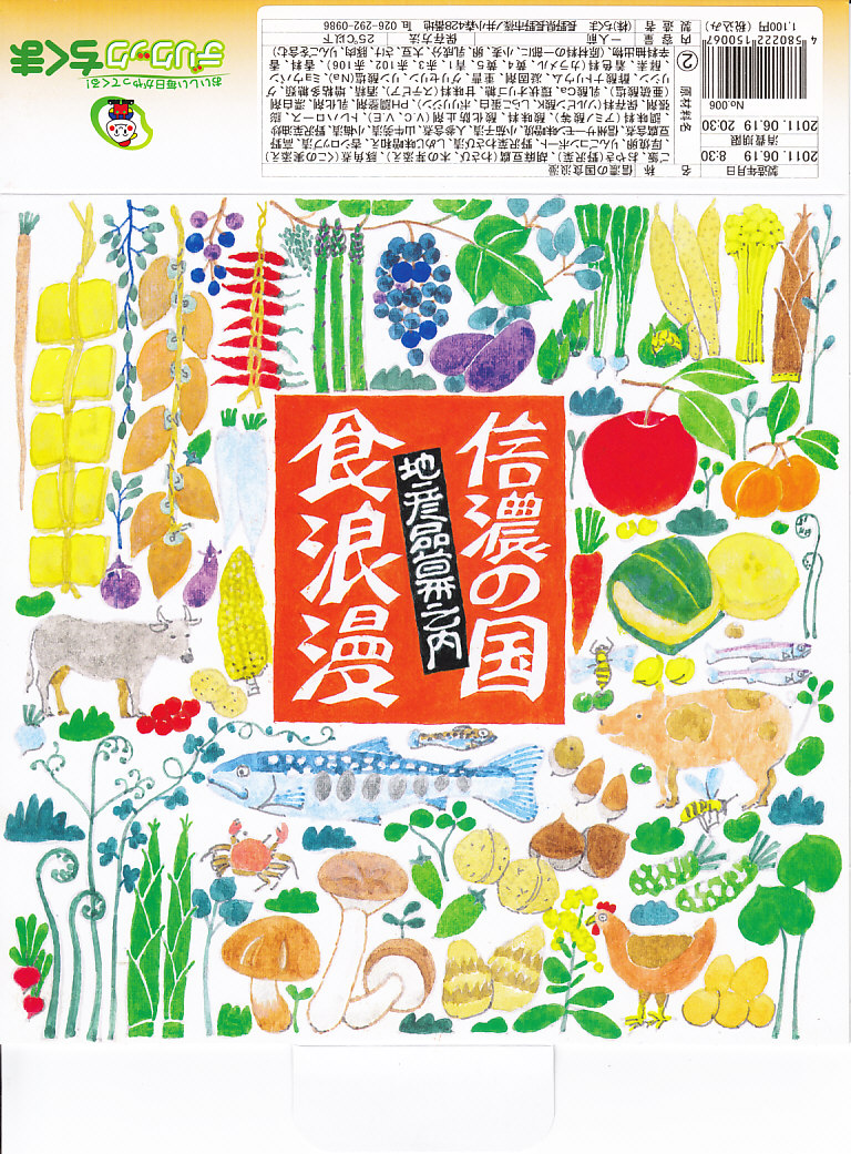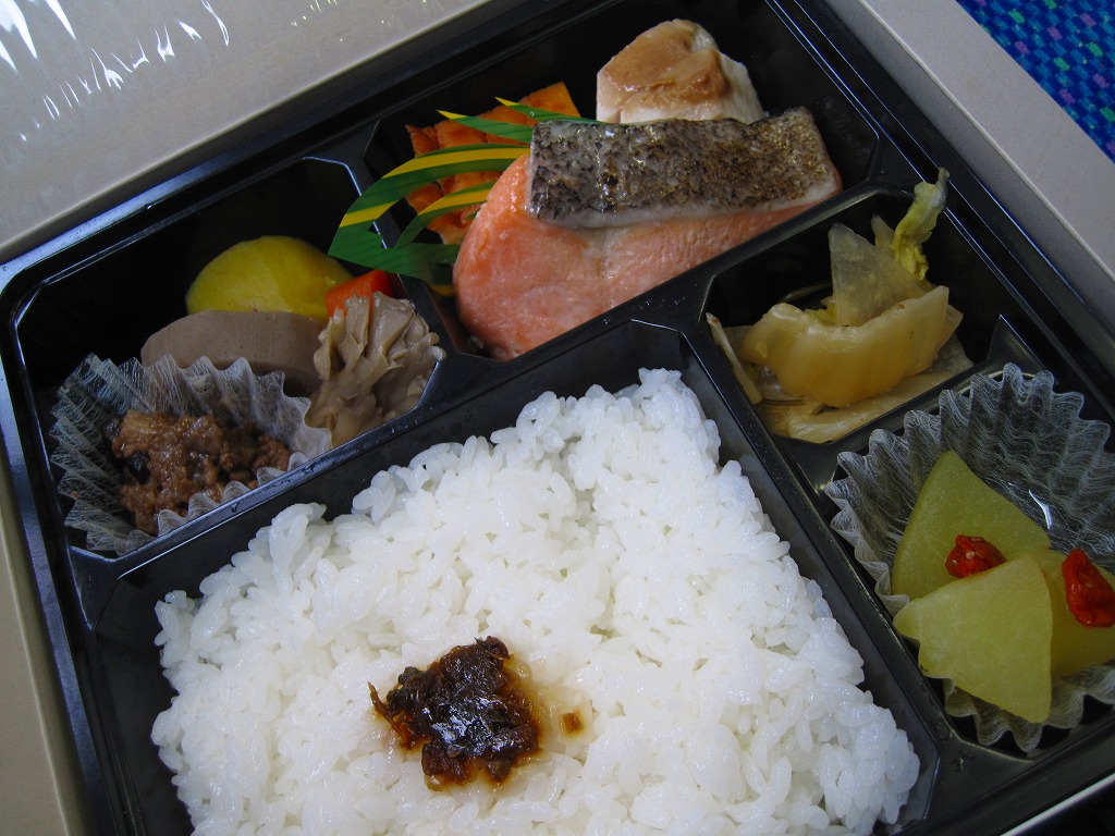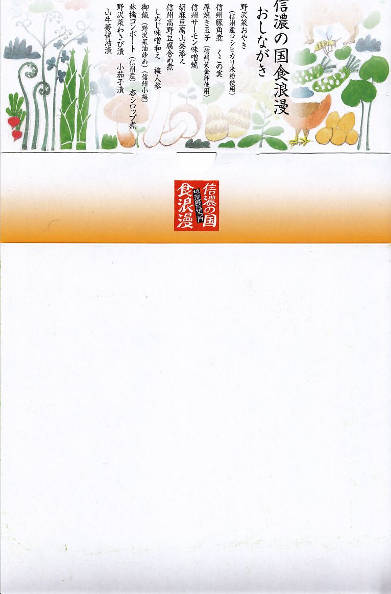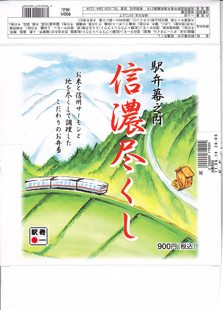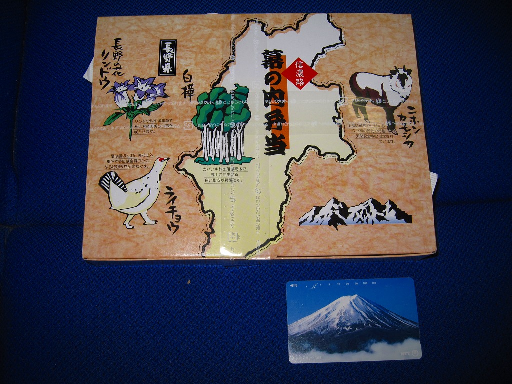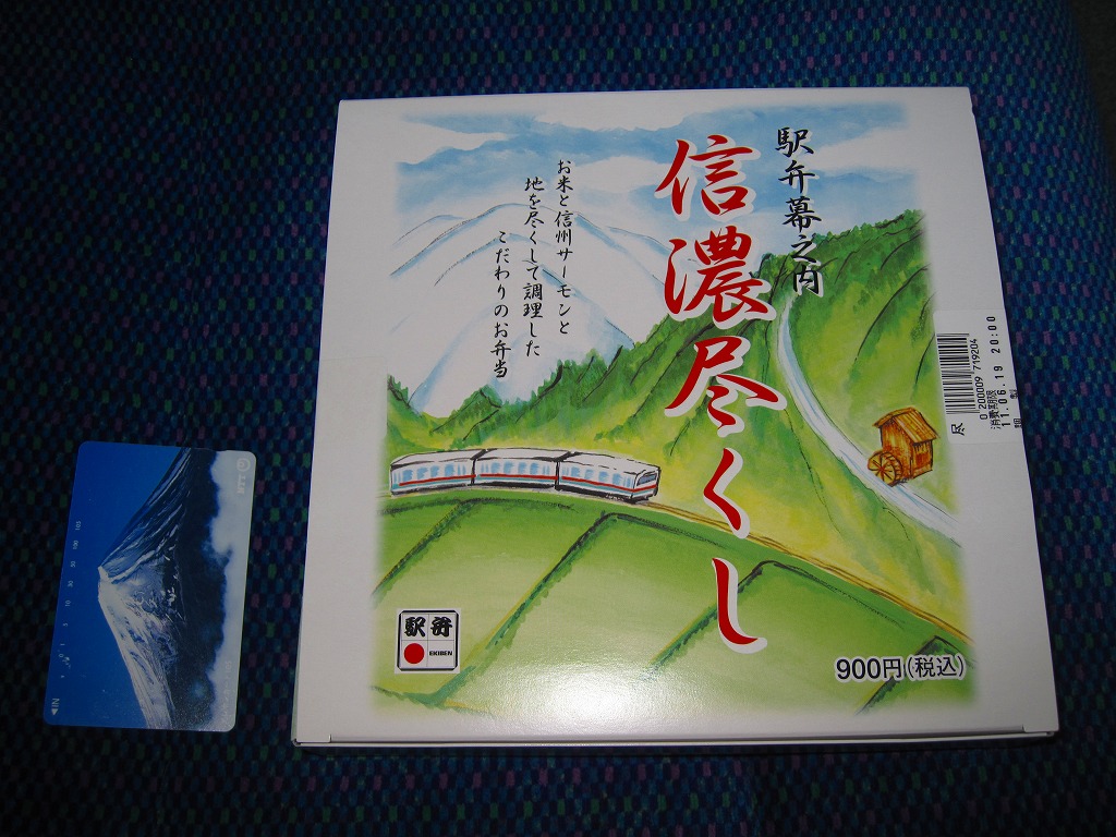 2007(平成19)年の夏までに発売か。野山を拙く描いた専用のボール紙箱を使用、黒いプラ製トレーに収まる中身は、白御飯に信州サーモン粕漬け焼き、信州産福味鶏の信州味噌田楽、信州サーモン入りの玉子焼き、信州牛のしぐれ煮と野菜の彩り、信州林檎のコンポートなど。コンセプトや使用食材のこだわりがあるも、内容は幕の内駅弁らしいもの。