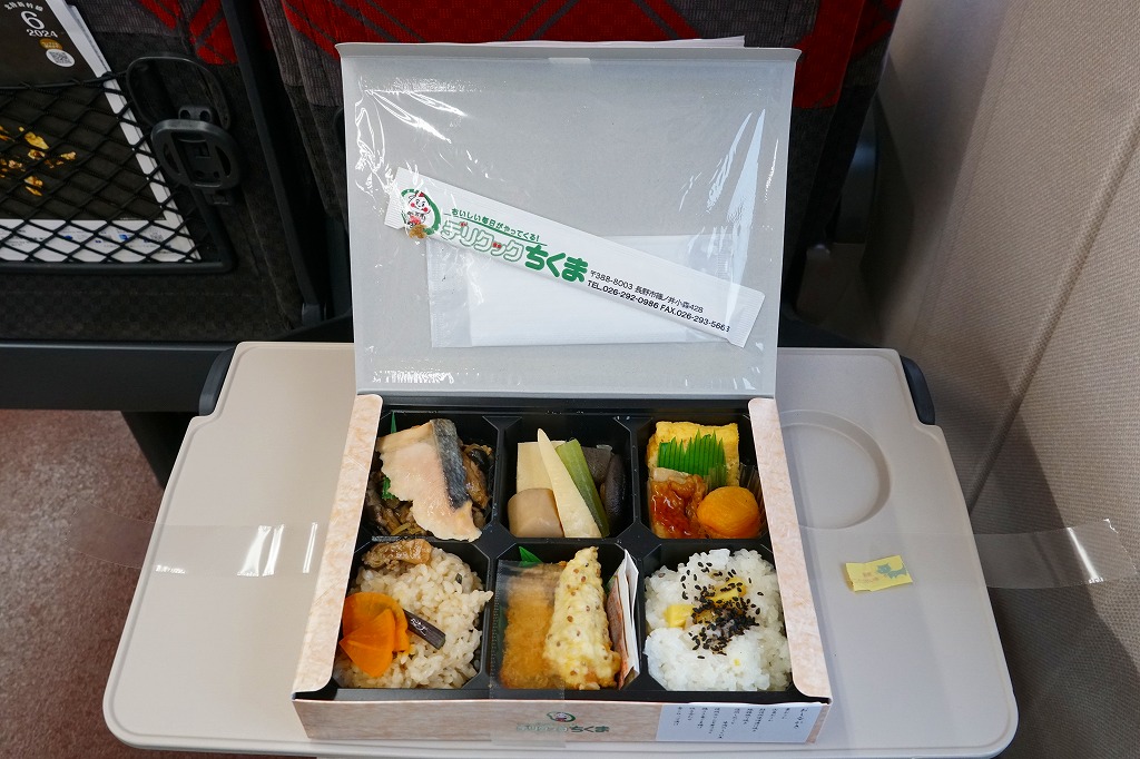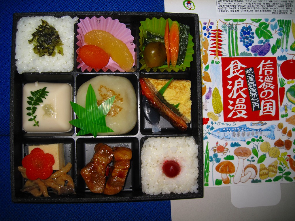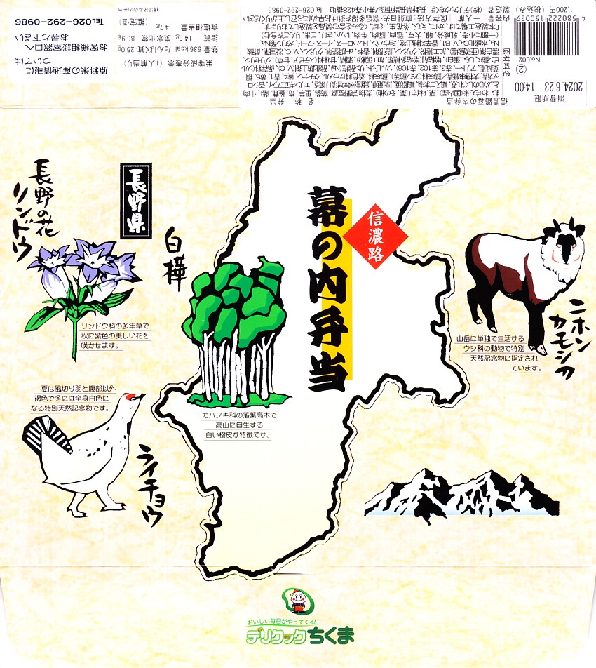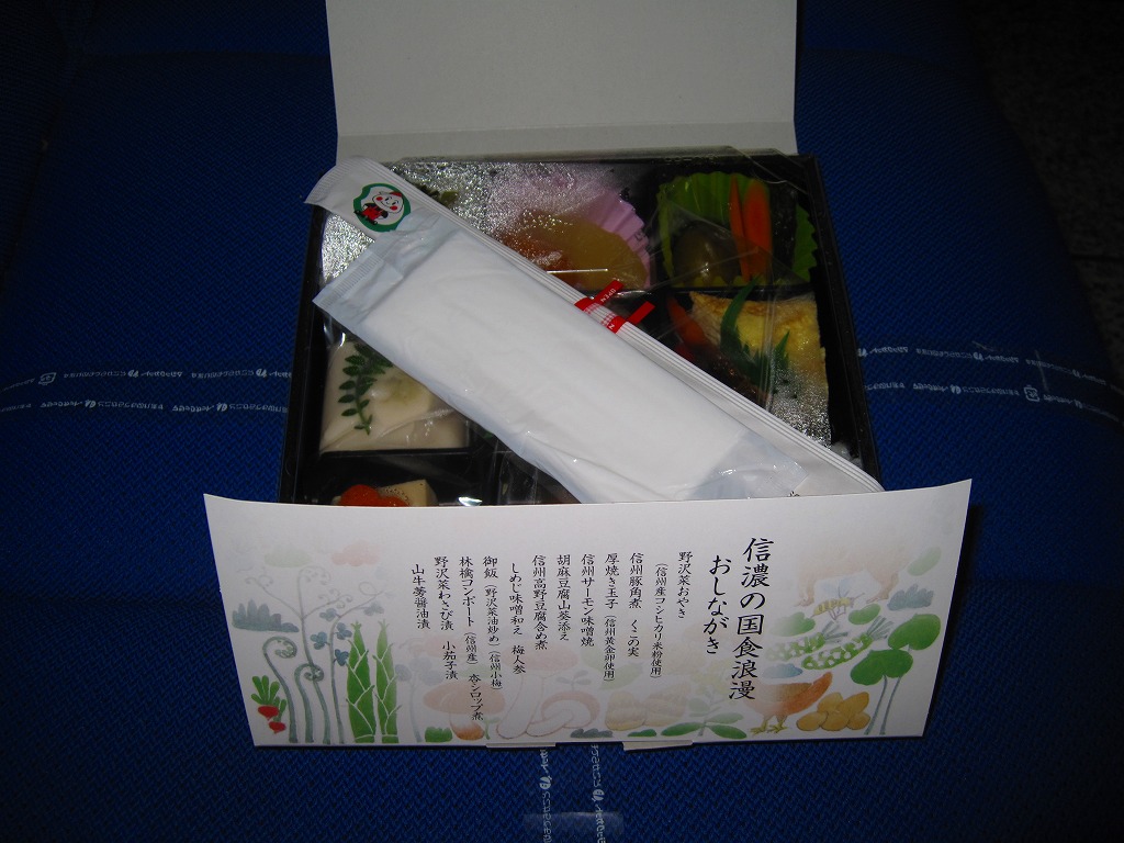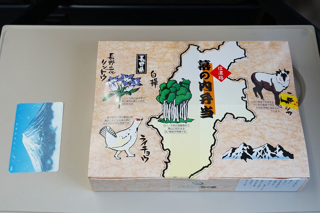 2007(平成19)年6月に長野駅で発売。長野県やいくつかのイラストを描いた専用のボール紙箱を使用、黒いプラ製トレーの6区画に詰まる中身は、山菜おこわ、栗おこわ、サトイモや高野豆腐などの煮物、牛肉とシメジのしぐれ煮にサーモン味噌焼、エリンギのフライと鶏えごま揚、地鶏照焼と玉子焼とあんずシロップ漬。特殊駅弁と呼ばないまでも、幕の内の定義からはみ出した好印象。調製元は長野市内の給食業者だが、これに仕出し弁当や惣菜弁当の雰囲気はなく、駅弁としての姿形と風格を備えていると思う。価格は2010年時点で1,000円、2016年時点で1,100円、2023年時点で1,200円、2024年10月時点で1,350円。