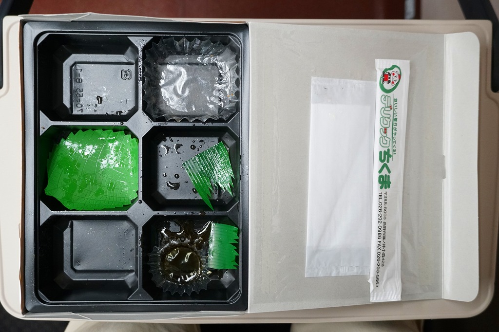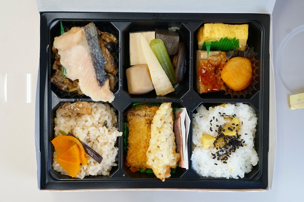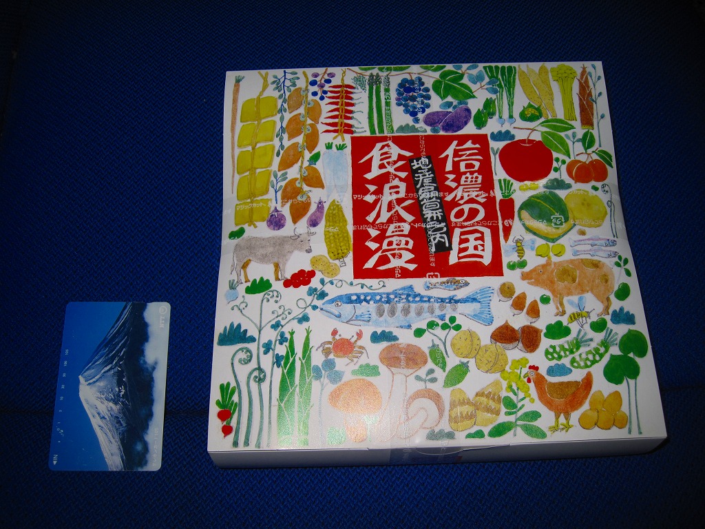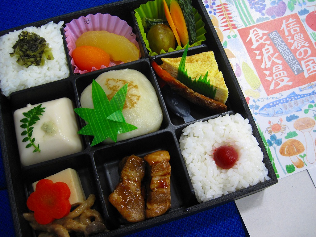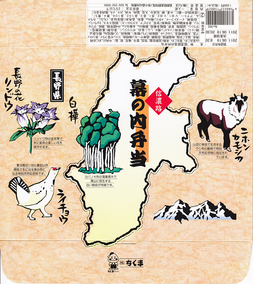 2007(平成19)年6月に長野駅で発売。長野県やいくつかのイラストを描いた専用のボール紙箱を使用、黒いプラ製トレーの6区画に詰まる中身は、山菜おこわ、栗おこわ、サトイモや高野豆腐などの煮物、牛肉とシメジのしぐれ煮にサーモン味噌焼、エリンギのフライと鶏えごま揚、地鶏照焼と玉子焼とあんずシロップ漬。特殊駅弁と呼ばないまでも、幕の内の定義からはみ出した好印象。調製元は長野市内の給食業者だが、これに仕出し弁当や惣菜弁当の雰囲気はなく、駅弁としての姿形と風格を備えていると思う。価格は2010年時点で1,000円、2016年時点で1,100円、2023年時点で1,200円、2024年10月時点で1,350円。