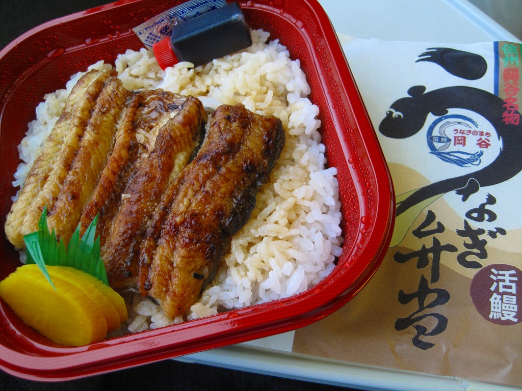 岡谷の商工会議所は、1995(平成7)年からウナギでの街おこしを目指している。かつて諏訪湖でウナギがよく獲れた名残として、岡谷市内にはウナギ屋が多いという。市内の魚料理屋の団体「うなぎのまち岡谷の会」で開発した弁当、といってもただの鰻丼であるが、JR駅のキオスクが駅弁化を要請し、こうして駅で商品化された。訪問時の岡谷駅では売店に写真を掲示するものの実物がなかったが、茅野駅で無事に購入できた。