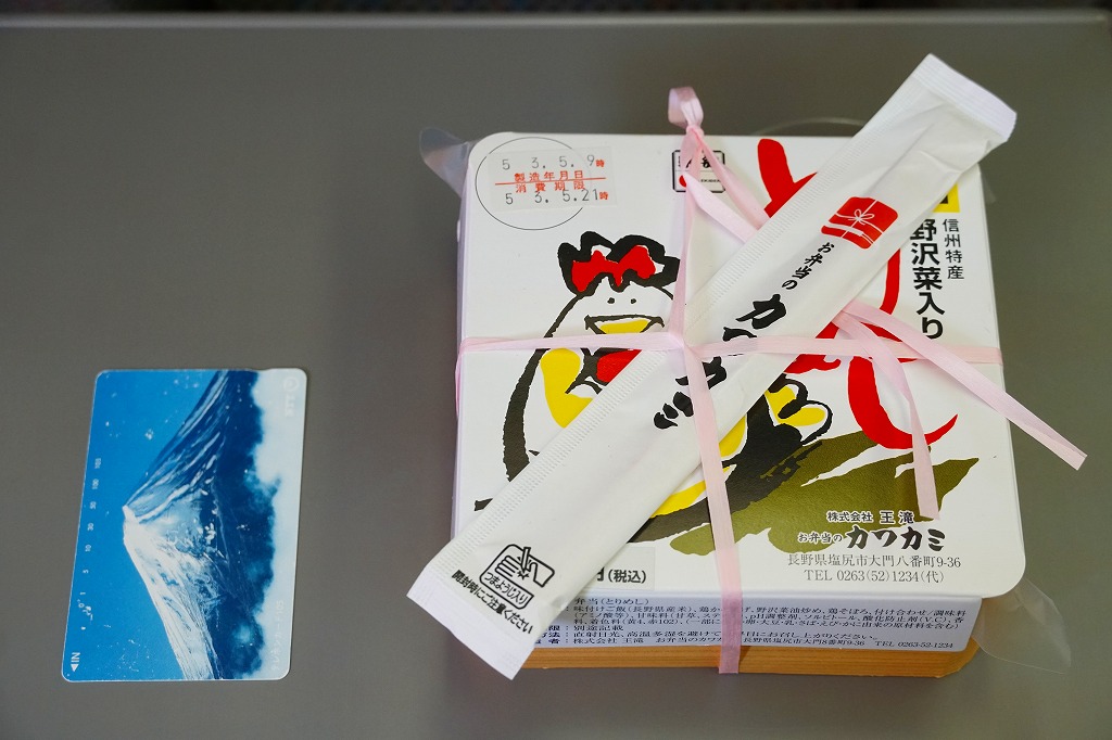 横に細長い容器に、茶飯を敷き、とりそぼろと鶏照焼、野沢菜の油炒め、錦糸卵、山菜、紅生姜で覆い、生野菜サラダとワインゼリーを添える。その内容はまるで、まるで既存の塩尻駅弁「とりめし」の拡大版。掛紙の絵柄も似ているし、だいたい1.5倍くらいの分量が入り、ざらついて油っぽい味も健在。2020年までの販売か。