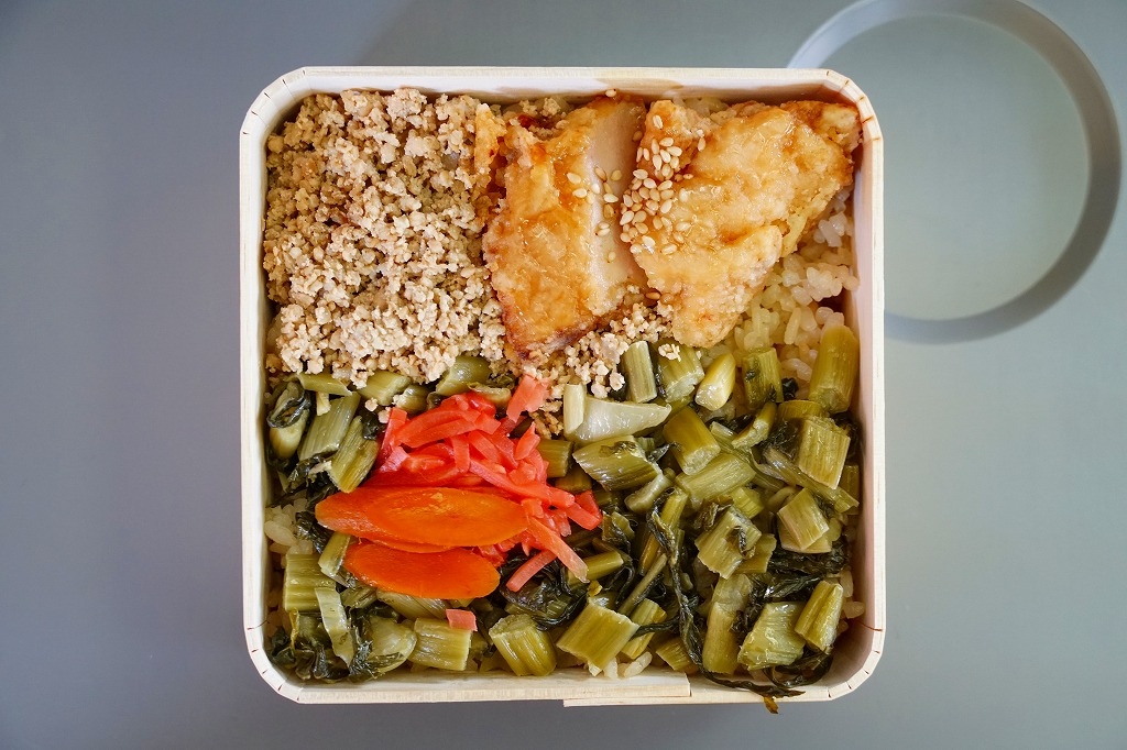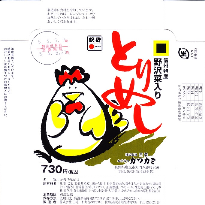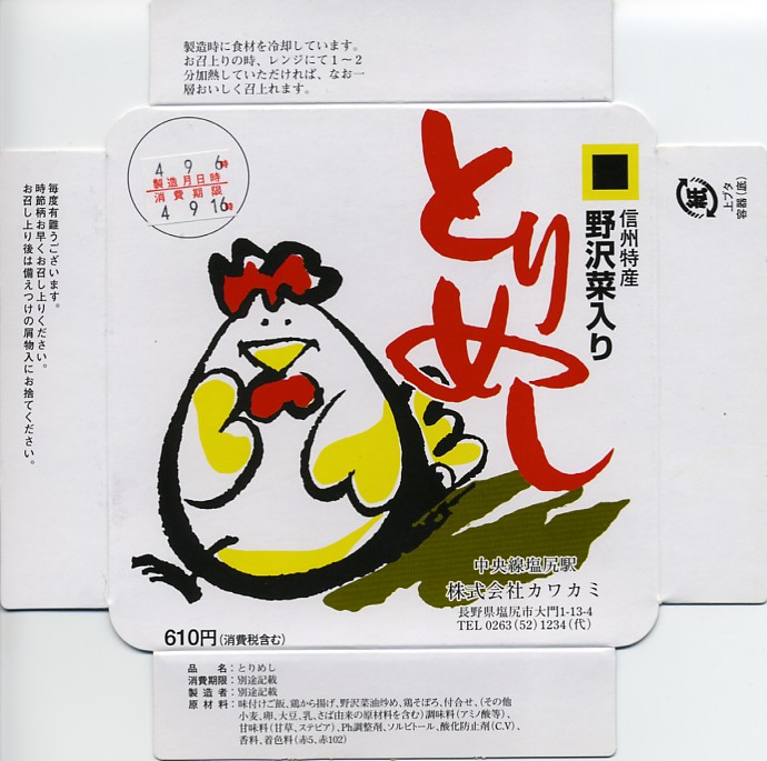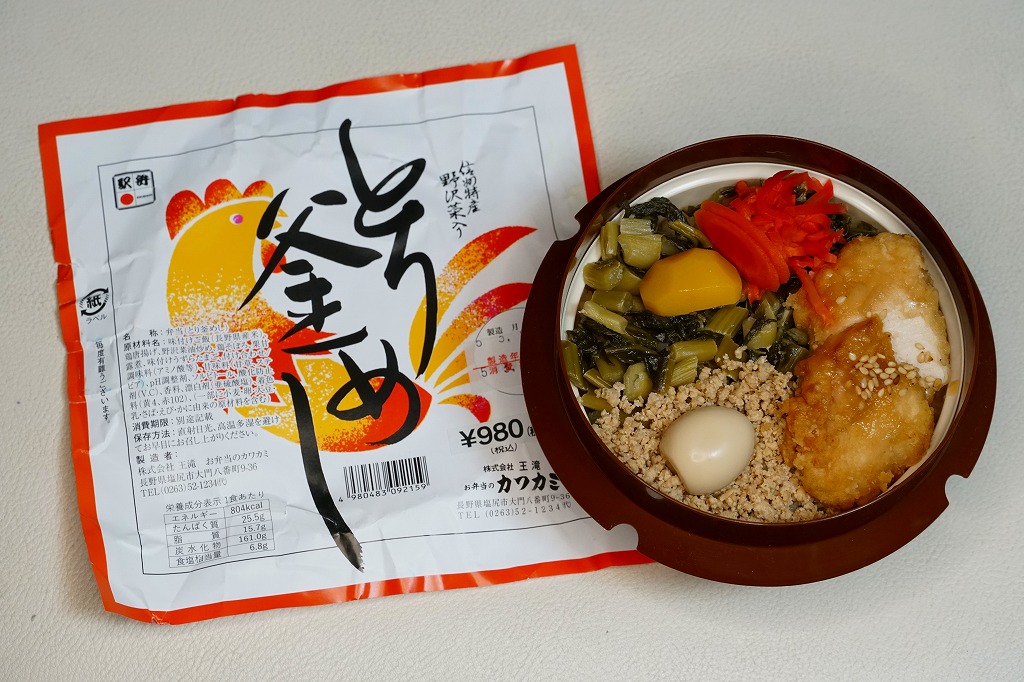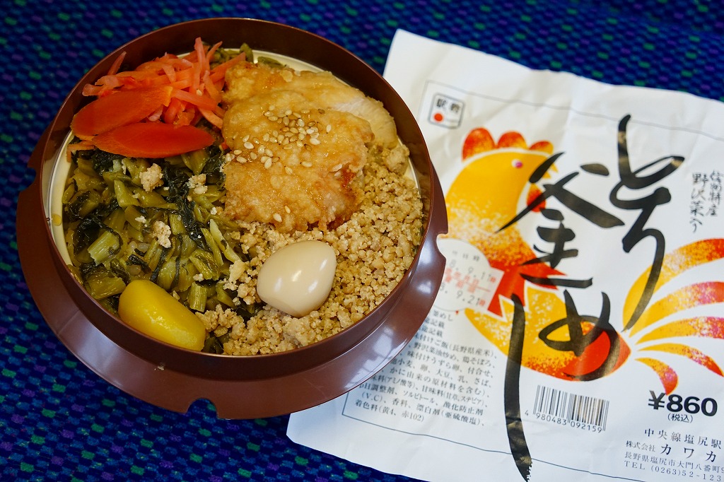 1953(昭和28)年の発売という、塩尻駅弁のロングセラー。やや上げ底な正方形の容器に味付けご飯を詰め、野沢菜炒め、鶏唐揚、鶏そぼろで覆い、紅生姜と漬物を載せる。たっぷりの野沢菜を含め、飯も肉も油っぽいところが特徴で、この味が70年もの間親しまれる。ニワトリを卵形に描くふたの絵柄も昭和時代から変わらず、塩尻駅や松本駅の駅弁売店で見つけやすい。2023年時点で一日あたり1000個から3000個くらいが売れるという。価格は2005年時点で610円、2015年時点で650円、2021年時点で700円、2023年時点で730円。