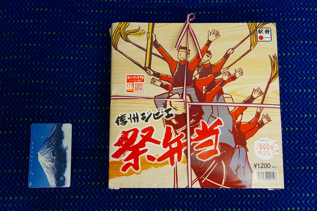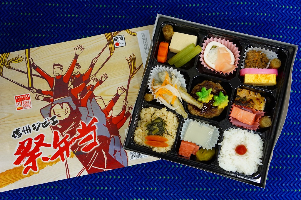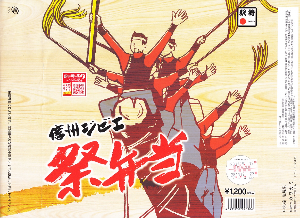 諏訪大社の式年造営御柱大祭を記念し、2016(平成28)年4月に発売。そう言われると確かに、掛紙の絵柄が御柱祭の木落としの光景である。同年秋のJR東日本の駅弁キャンペーン「駅弁味の陣2016」では、「主な販売駅 松本駅・塩尻駅」でエントリーされたが、掛紙に「中央線 塩尻駅」とあるので、塩尻駅弁のページに収蔵。