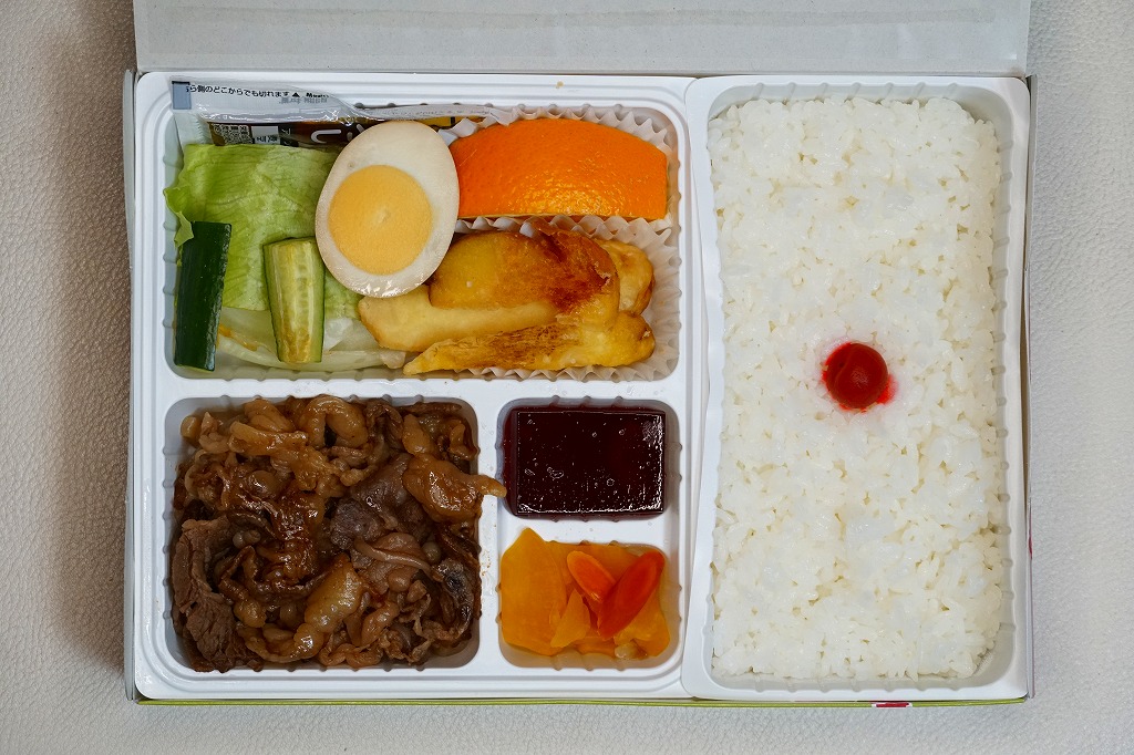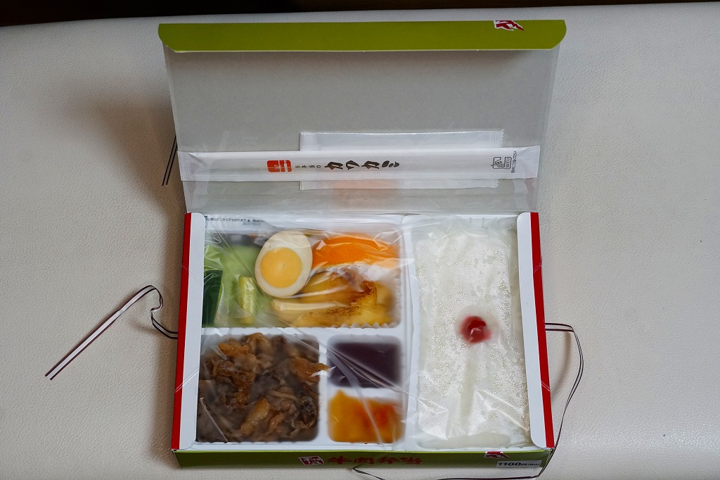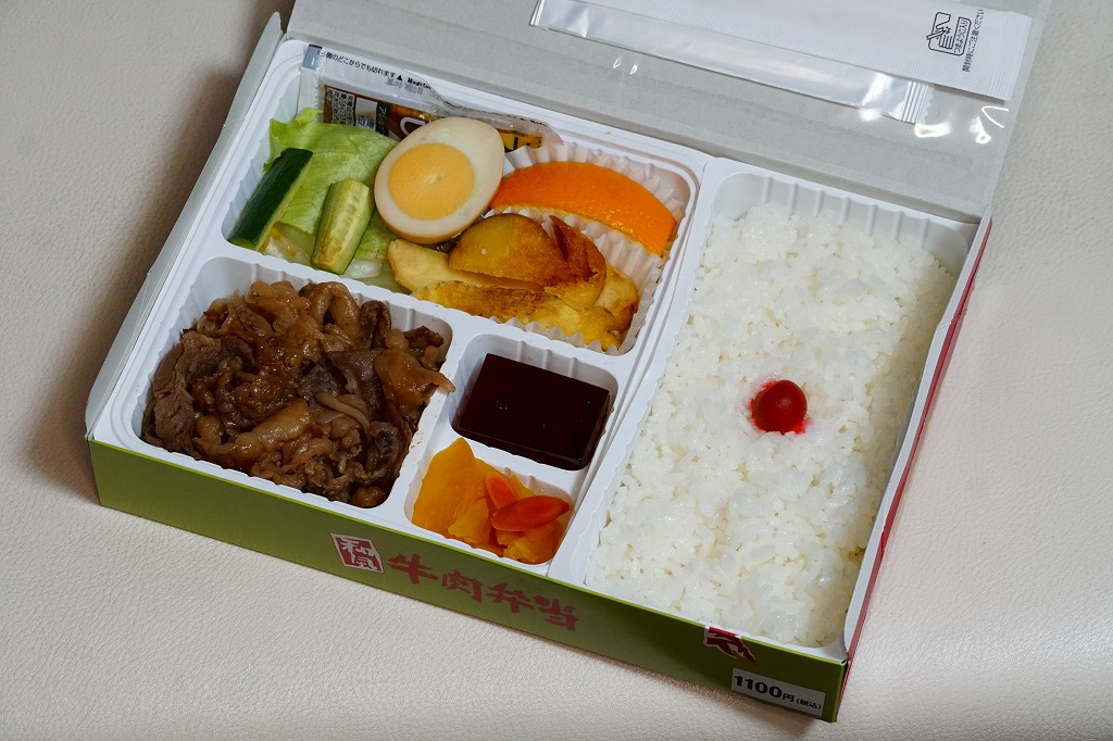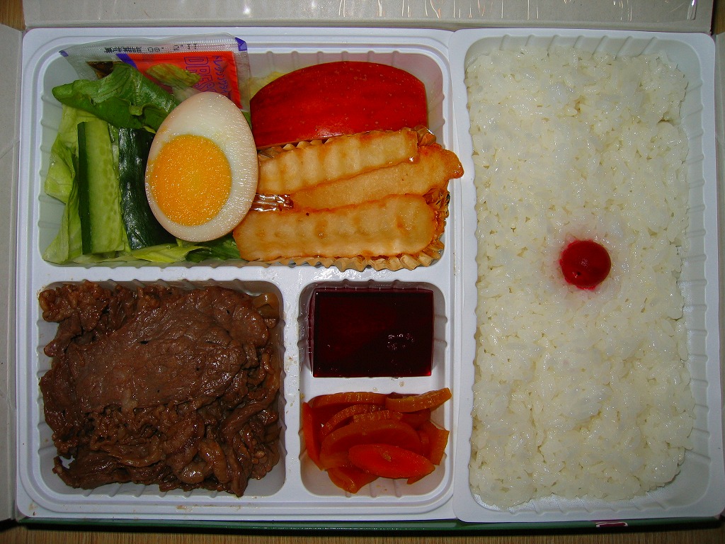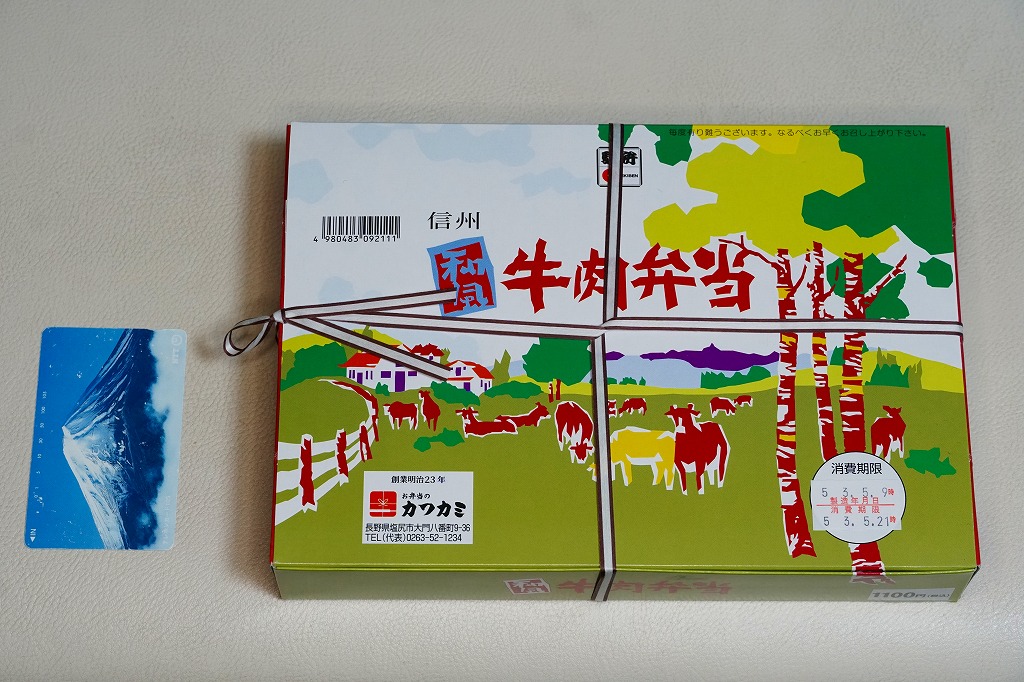塩尻駅で平成時代の発売だろうか。白樺や牧場の風景を描いた専用の紙箱に、白いプラ製トレーを使い、日の丸御飯、レタスときゅうりと果物、フライドポテト、煮玉子、牛焼肉、ワインゼリー、漬物などを詰める。そんな見た目は、牛肉弁当というよりは牛肉入り幕の内駅弁。柔らかく脂身豊かな牛肉煮は醤油風味で、生野菜とフルーツが入り、駅弁の名前を表す。価格は2008年時点で950円、2014年4月の消費税率改定で980円、2021年時点で1,100円。