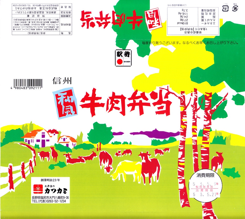 2005(平成17)年4月9日に購入した、塩尻駅弁のふた。その絵柄は下記の1980年代も、上記の2023年ものとも変わらない。容器も内容も味も変わらないと思う。