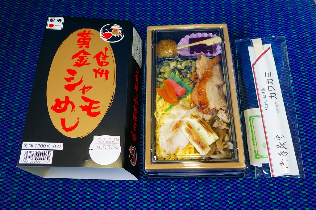 2010(平成22)3月の発売か。長方形の容器に鶏ガラならぬシャモガラスープで炊いた茶飯を詰め、野沢菜の油炒め、錦糸卵、信州黄金シャモ肉の照焼と煮物の各2切れ、ネギや糸こんにゃくやマイタケなどで覆い、五平餅とワインゼリーを添える。つまり鶏飯。信州黄金シャモの照焼は締まってうまく、価格が高いためか他の食材の種類や見栄えも類例よりさすがに優れているが、どこかを略して千円になれば、駅弁として買いやすくなると思った。2021年までの販売か。