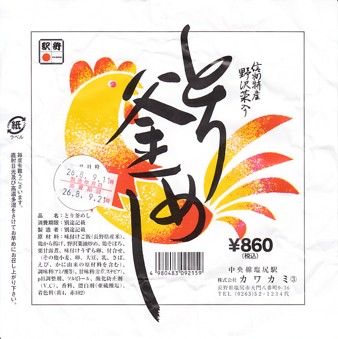 2014(平成26)年8月9日に購入した、塩尻駅弁の掛紙。その絵柄は上記の2023年や下記の2003年のものと変わらない。内容も変わらない。調製元と値段は変わった。