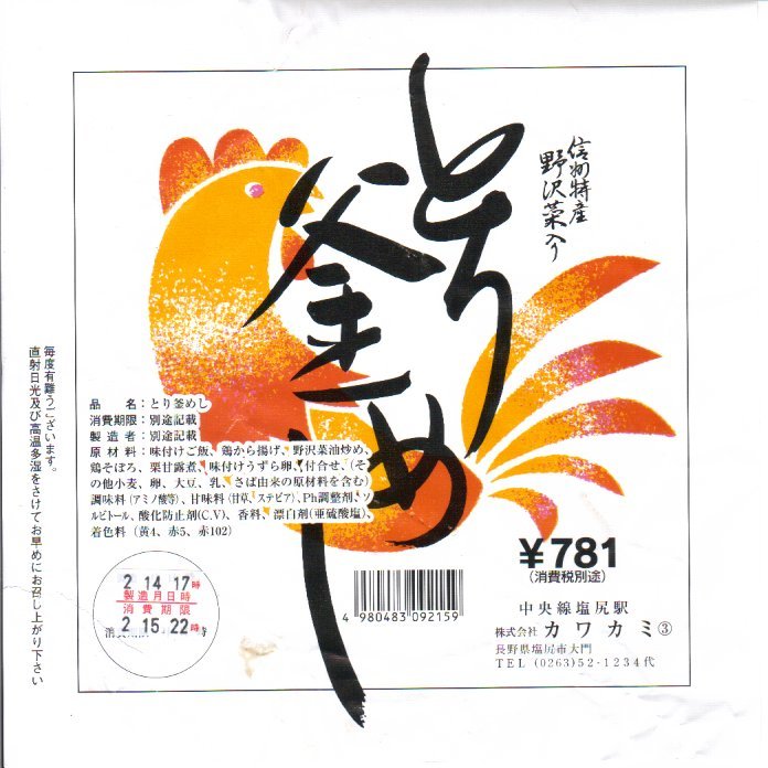 1980年代までには塩尻駅で発売か。釜飯駅弁向けプラ容器に、味付け御飯を詰め、とりそぼろ、野沢菜の油炒め、鶏唐揚で覆い、うずら卵、くり、紅生姜で彩る。そんな内容は、同じく塩尻駅の駅弁「とりめし」とほぼ同じ。飯も肉も油っぽいところも同じ。値段も容器も、こちらが少し高級品か。他の釜飯駅弁にない、素朴な感じを受ける。価格は2003年時点で820円、2014年時点で860円、2021年時点で970円、2023年時点で980円。