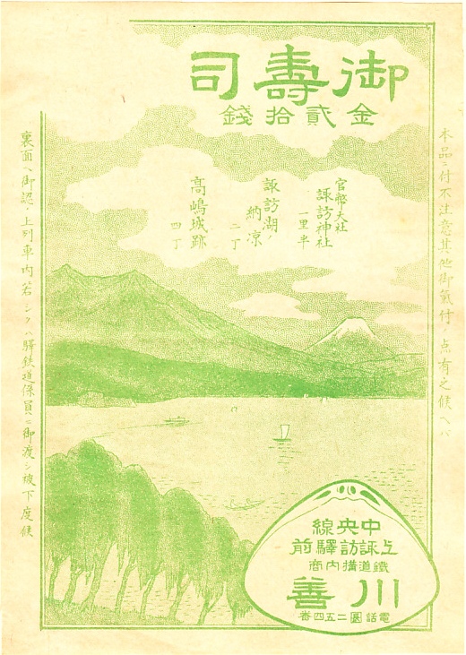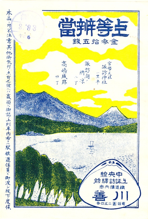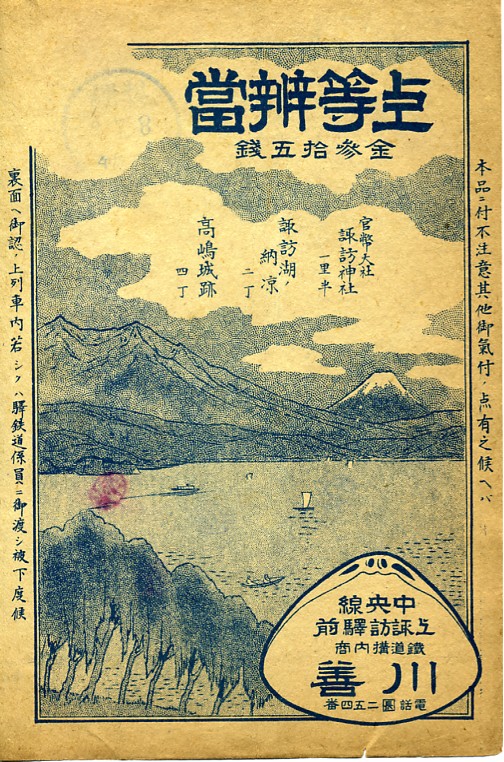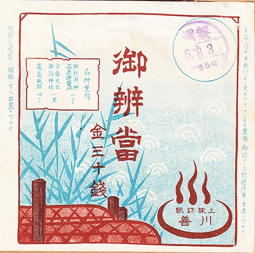 1931(昭和6)年8月3日5時の調製と思われる、昔の上諏訪駅弁の掛紙。水面と笹藪と蛇籠で諏訪湖を描いたように思えるがどうだろう。ここでの名所は、諏訪湖畔温泉遊覧地、官幣大社諏訪神社、高島城跡。調製元の名前と駅名が温泉マークに入る。
