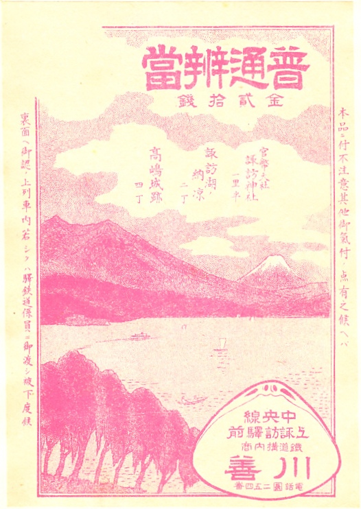 おそらく1920年代、大正時代末期か昭和時代初期のものと思われる、昔の上諏訪駅弁の掛紙。諏訪湖と富士と八ヶ岳を描く構図は、上記の掛紙「御壽司」「上等辨當」と同じで、色が違う。「、色は違えどまったく同じ絵柄。「並等辨當」や「御辨當」でない「普通辨當」の名は、当時の鉄道省の規程にあるものの、この名をそのまま使う事例は珍しいと思う。