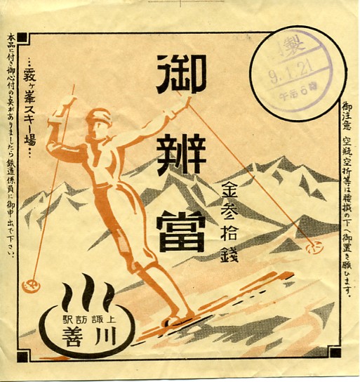 1934(昭和9)年1月21日18時の調製と思われる、昔の上諏訪駅弁の掛紙。当時の人々はこんな格好をしてスキーを楽しんでいたことや、当時から霧ヶ峰(霧ヶ峯)がスキーの名所だったことが分かる。