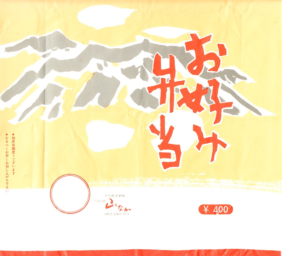 1978(昭和53)年10月9日の調製と思われる、昔の辰野駅弁の掛紙。1983年に塩嶺トンネルが開通するまで、辰野駅は中央本線と飯田線の乗換駅であり、特急「あずさ」や急行列車が止まり、駅弁も売られた。これはアルプスの山並みを描いた、並等幕の内駅弁か。