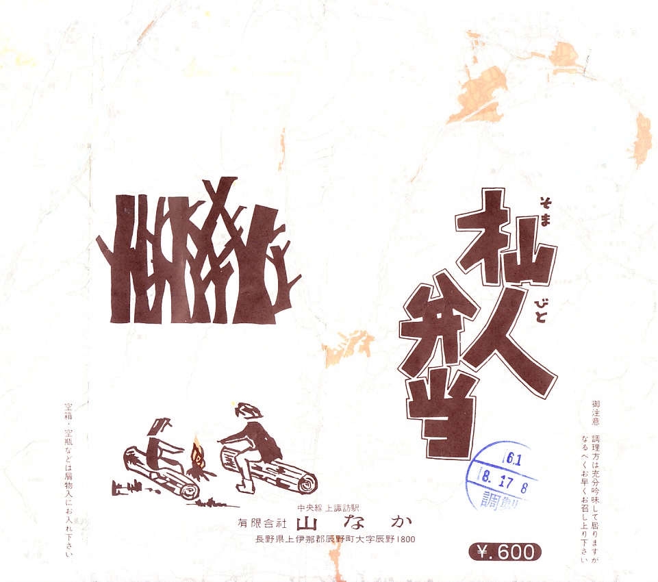 1986(昭和61)年8月17日8時の調製と思われる、昔の上諏訪駅弁の掛紙。この絵柄は1990年代の終売まで変わらなかった。