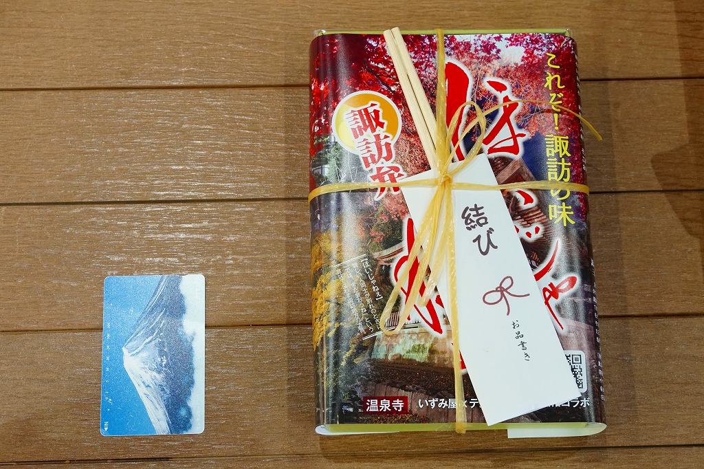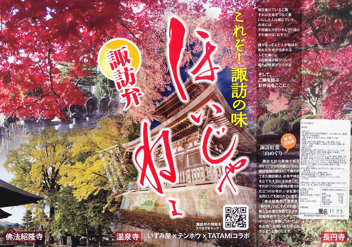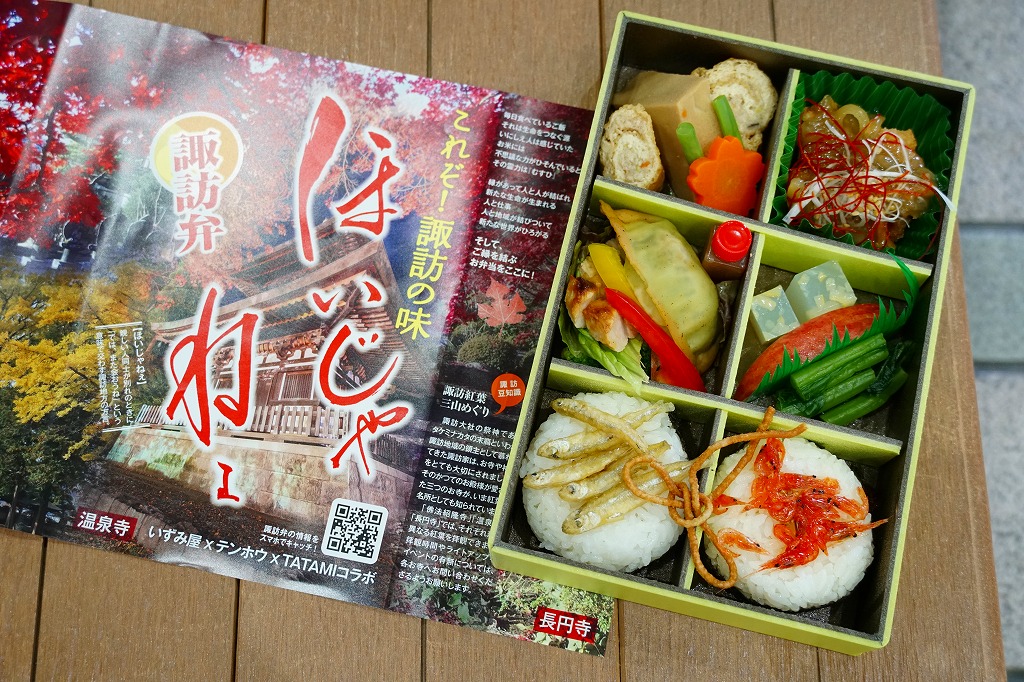 2020(令和2)年1月24日の発売。上諏訪駅前の「れすとらん割烹 いずみ屋」、諏訪で1956(昭和31)年に創業したラーメンチェーン店「テンホウ」、2017(平成29)年に開業した上諏訪駅徒歩5分のゲストハウス「TATAMI」の3者が、諏訪の食と観光の魅力をアピールしようと弁当を開発し、JR上諏訪駅のコンビニエンスストア「NEWDAYS」で売られるようになったもの。調製はいずみ屋が担当。