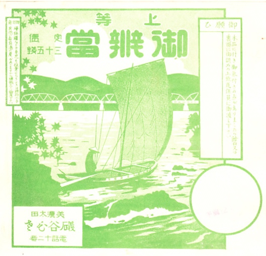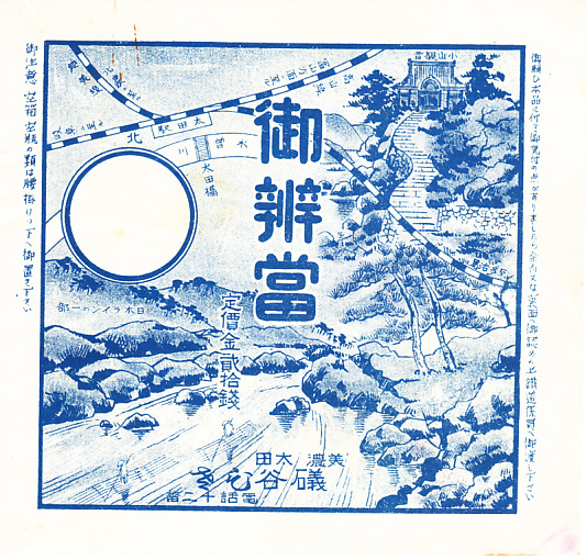 第二次大戦前のものと思われる、昔の美濃太田駅弁の掛紙。小山観音と日本ラインの一部を描く。路線図の行き先から、高山本線が岐阜駅から富山駅まで全通した1934(昭和9)年10月や、越美南線が北濃駅に達した1934(昭和9)年8月より後のものか。調製元の礒谷ひさは、戦前昭和の美濃太田駅の構内営業者。上記の駅弁を販売した1954(昭和29)年創業の向龍館とは、おそらくつながっていない。
