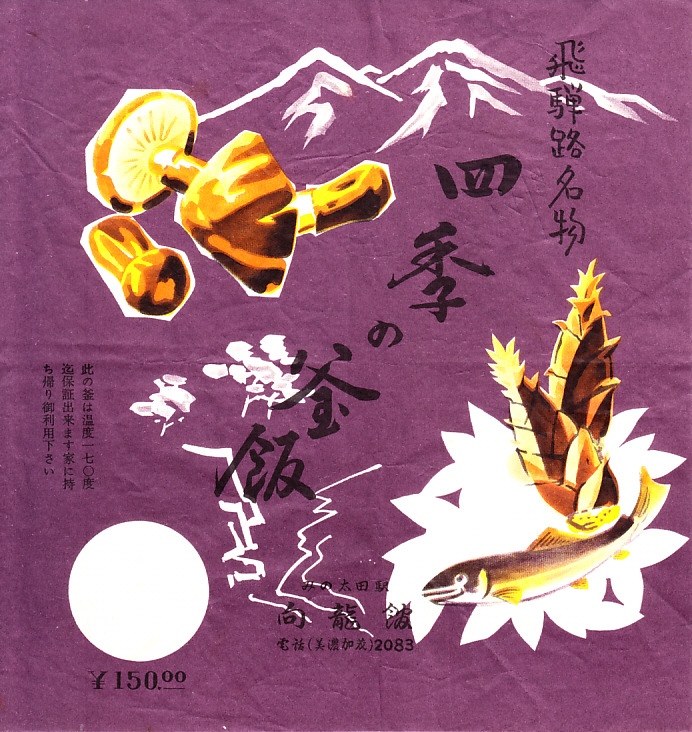 1960年代のものと思われる、昔の美濃太田駅弁の掛紙。21世紀まで生き残った「松茸の釜飯」とは別に、この四季の釜飯があったらしい。マツタケとシイタケやタケノコに日本ラインとその山並みを描いたように見える絵柄も、おそらく容器も、松茸の釜飯と同じようなもの。