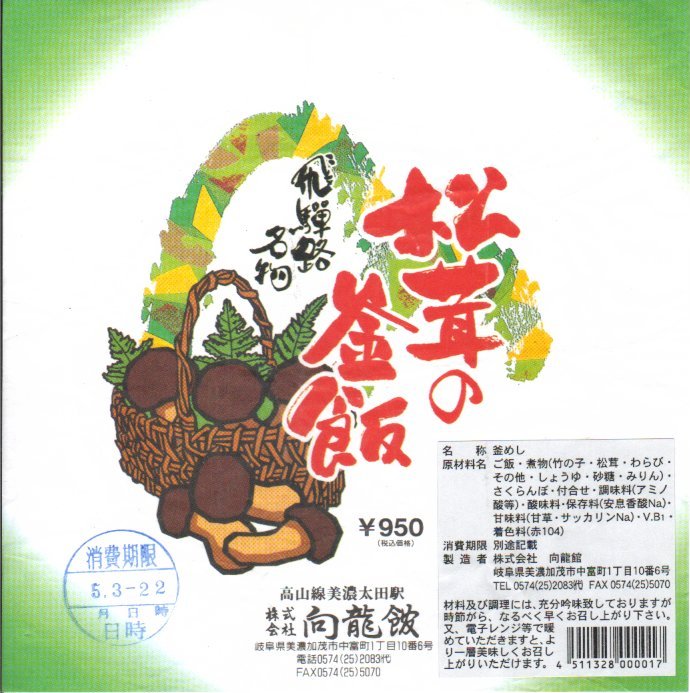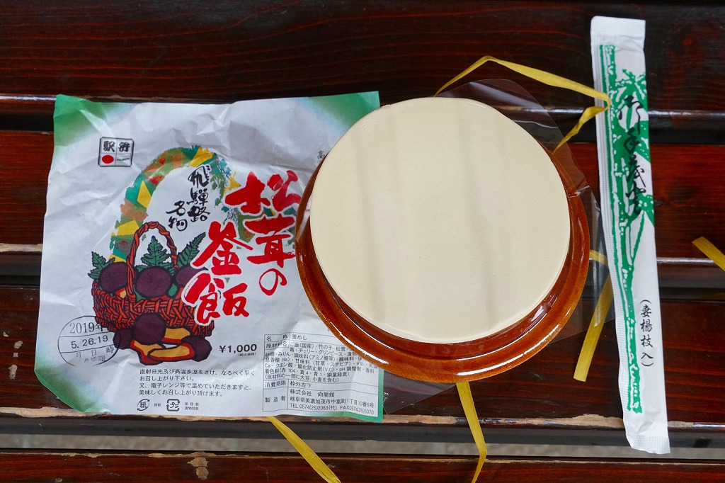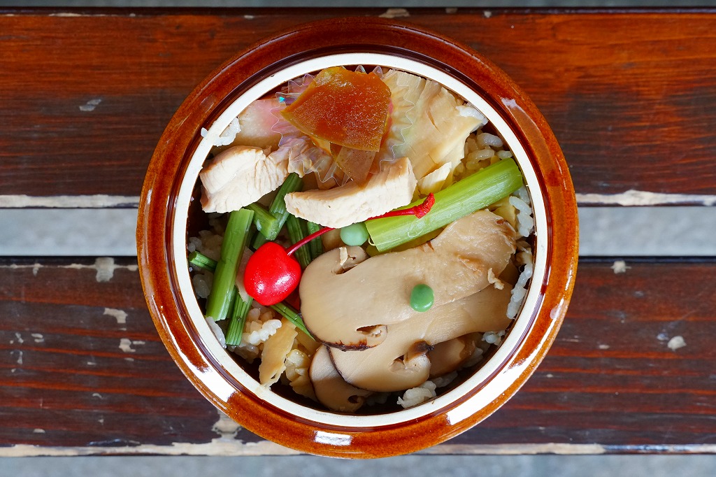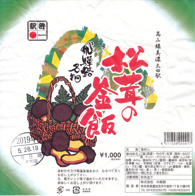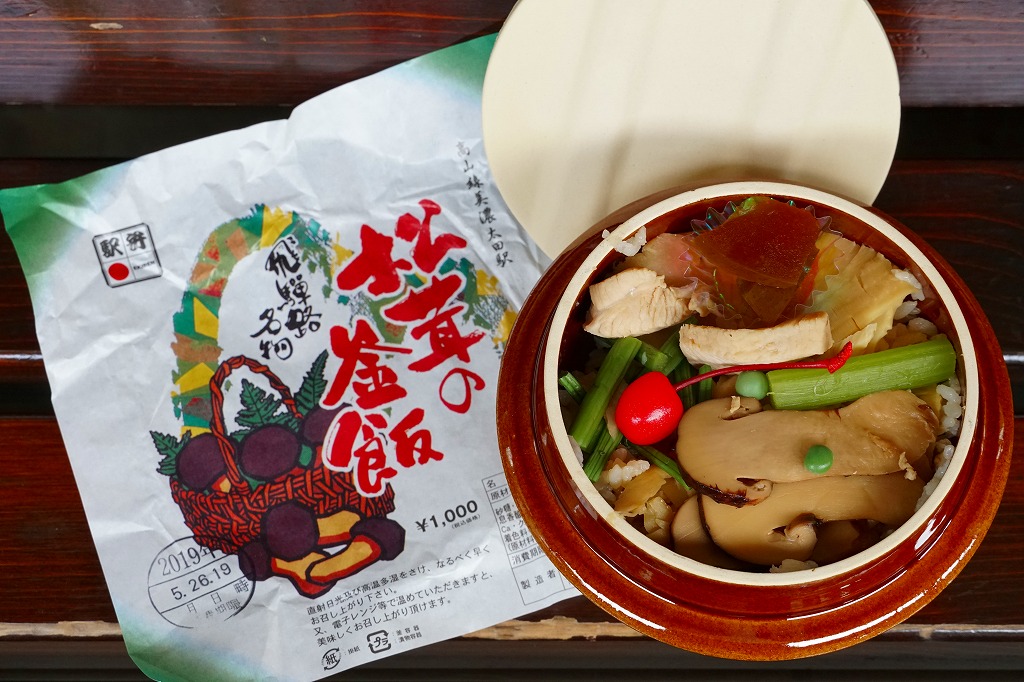1959(昭和34)年に発売。「舟弁当」なきあと、美濃太田駅で最も有名な駅弁であり、駅で普通に買えた唯一の駅弁。ふたまで陶製の釜飯容器に、山や松茸や必要な情報を描いた薄手の掛紙をかけて、ひもで十字にしばる。中身は茶飯の上に松茸、鶏肉、タケノコ、ワラビを載せて、グリーンピースを散らしてさくらんぼを添えるもの。