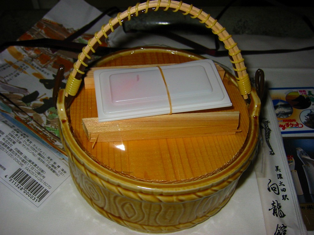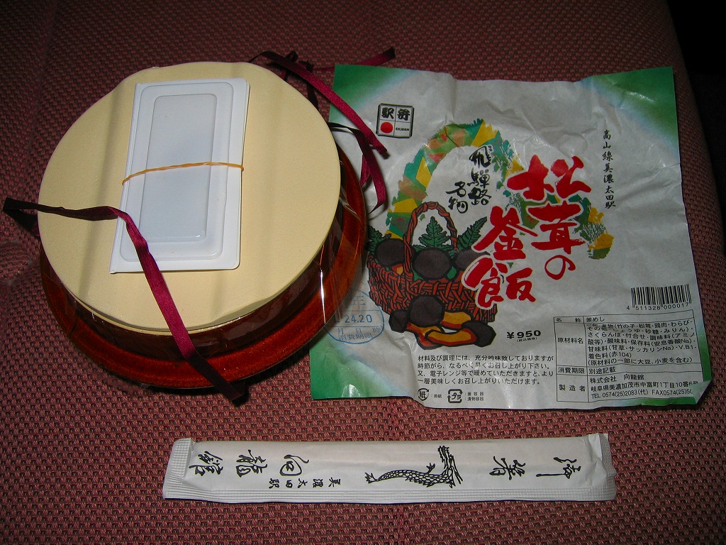 しかもこの駅弁は、立ち売りで売られた。美濃太田駅は、JR東海管内や中部地方で唯一、駅弁を立ち売りする駅であり、21世紀の時点で栃木県の宇都宮駅から福岡県の折尾駅までの巨大な空白を埋める貴重な存在だった。美濃太田駅は見た目でもはや、駅弁が売れる駅ではないだろうから、駅弁文化の維持と継承のために買い支えなければならないと思った。なお、美濃太田駅構内と特急列車「ひだ」の車内販売では、JRの指導により軽いプラ製の釜飯容器を使用していた模様。