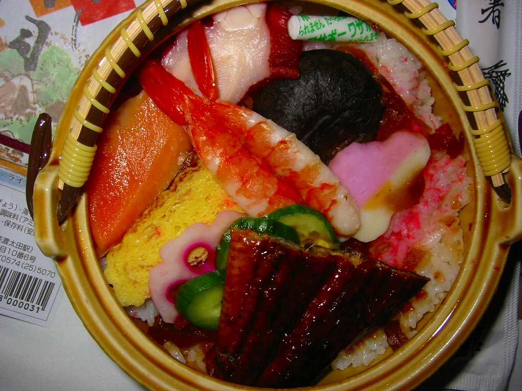 手桶型の美濃焼容器に木製のふたをして、掛紙をかけて紙ひもでしばる。中身は酢飯の上に海老、タコ、うなぎ、玉子焼、椎茸、キュウリなどを載せるもの。ちらし寿司にしては具が豪華で容器にも凝っているのに価格は千円以下と、お買い得な感じ。ただしふらりと駅に立ち寄っただけでは滅多に手に入らないようで、購入は予約か駅弁大会で。価格は2004年の購入時で950円、2015年時点で1,000円。調製元の撤退により2019年5月限りで終売。