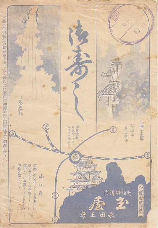 35銭の価格から、昭和14年でなく1925(大正14)年1月17日の調製と思われる、昔の大垣駅弁の掛紙。イラストで大垣城と養老の滝、そして交通案内で谷汲山が、名所として記される。