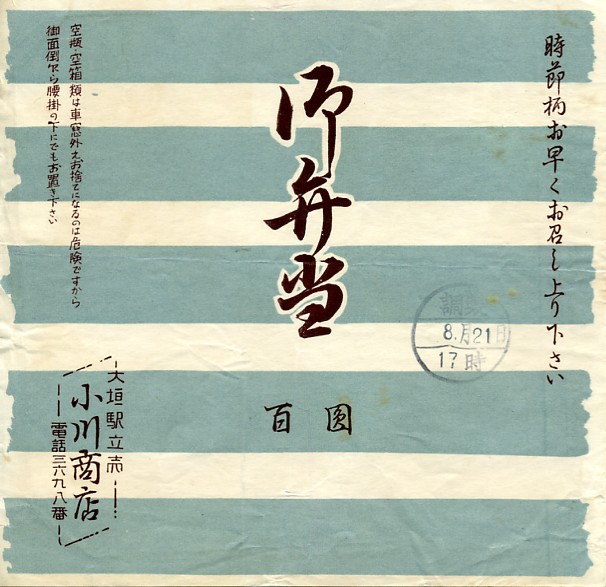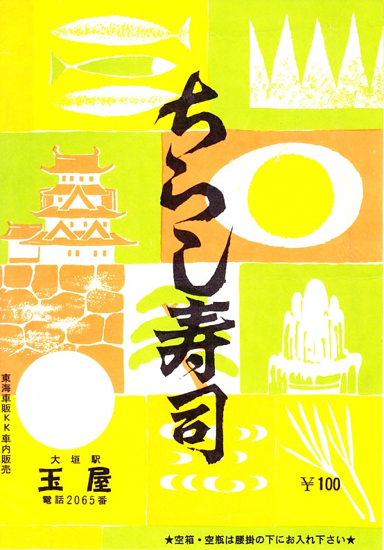 昭和30年代頃の、8月21日17時の調製と思われる、昔の大垣駅弁の掛紙。駅弁の名前は新字体なのに、価格が「百園」と旧字体。東京駅と大垣駅を結んだ夜行快速列車「ムーンライトながら」で大垣駅に乗り降りした度に、ここに駅弁があればよいのにと思った。ただ、もし駅弁が残っていても、春夏冬の「青春18きっぷ」の利用期間は人気列車の乗換競争や席取り合戦と混雑で駅弁どころではなく、そうでない期間は利用者が少なかったようで、駅弁があっても売りにくかったかもしれない。