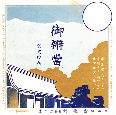 おそらく1930年代の調製と思われる、昔の高山駅弁の掛紙。上記の掛紙と同じもの。下記の「御寿し」とともに、当時の駅弁では日本一美しい掛紙だと思う。