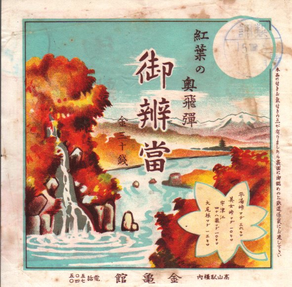 第二次大戦前の調製と思われる、昔の高山駅弁の掛紙。「紅葉の奥飛騨」が色鮮やかに描かれ、当館収蔵の駅弁掛紙の中で、最も美しいもののひとつだと思う。