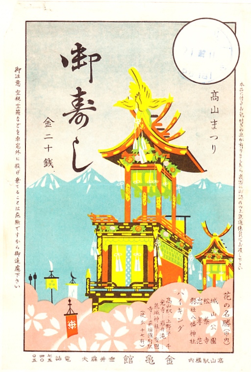 おそらく1930年代の調製と思われる、昔の高山駅弁の掛紙。春の高山まつりを描き、その山岳と屋台と桜花の光景は今も変わらない。上記の「御辨當」とともに、当時の駅弁では日本一美しい掛紙だと思う。