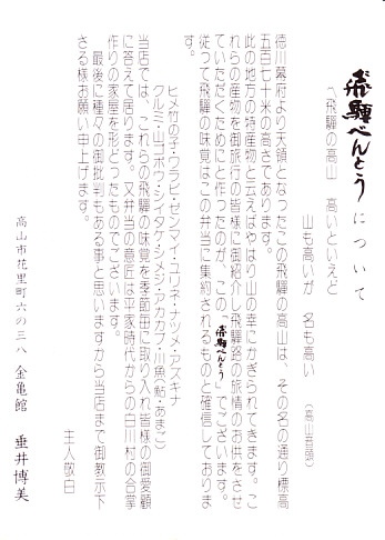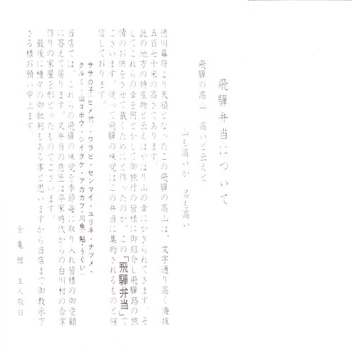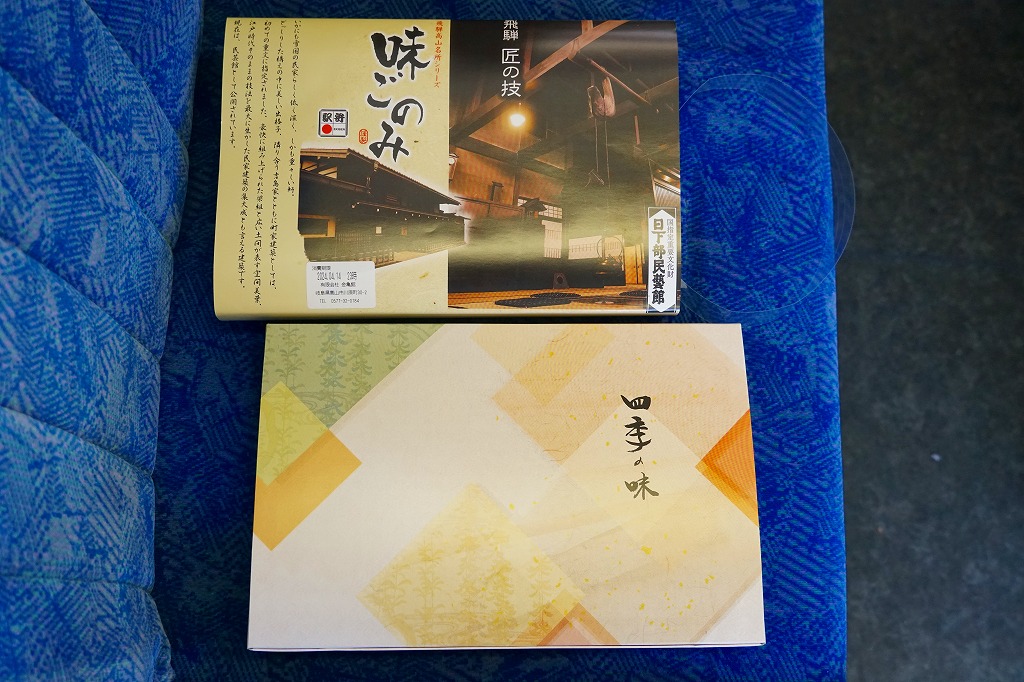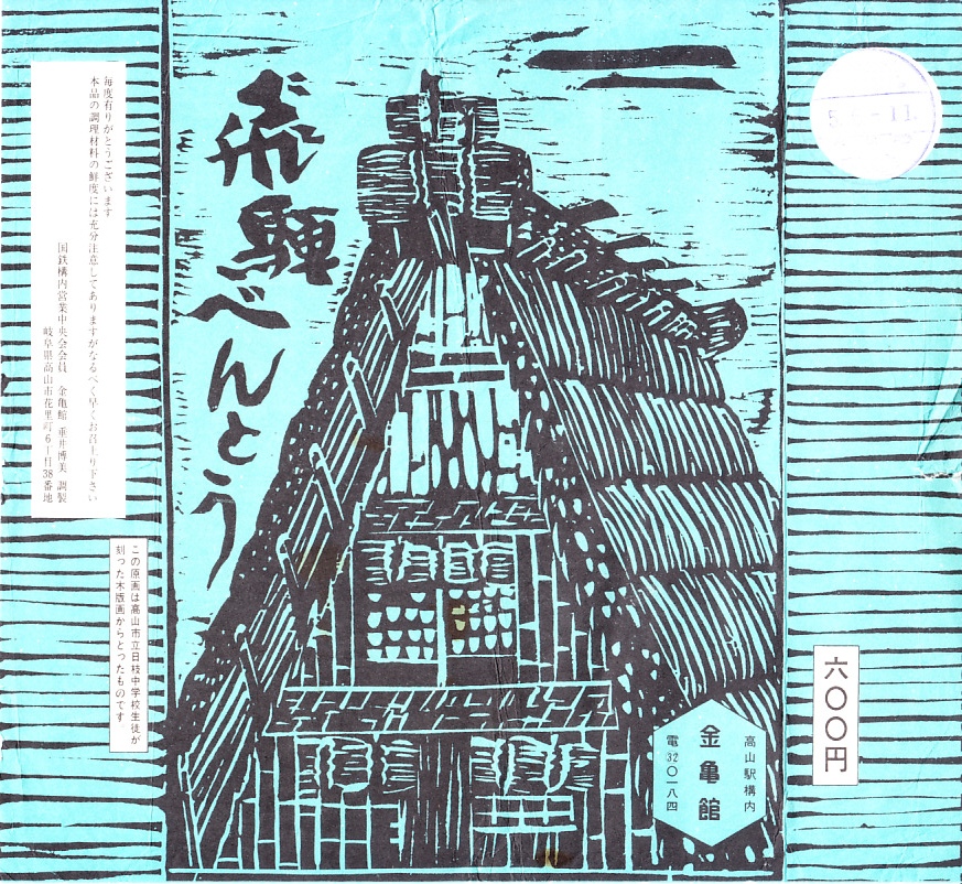 2008(平成20)年2月に、東海北陸自動車道の全線開通を記念して、下記の駅弁「飛騨べんとう」をリニューアル。1960年発売の「飛騨べんとう」の、白川郷などにある合掌造りの建物をモチーフにした、高山市立日枝中学校生徒が彫った木版画による掛紙の絵柄と、中身の山の幸という具材やその配置を承継した。
