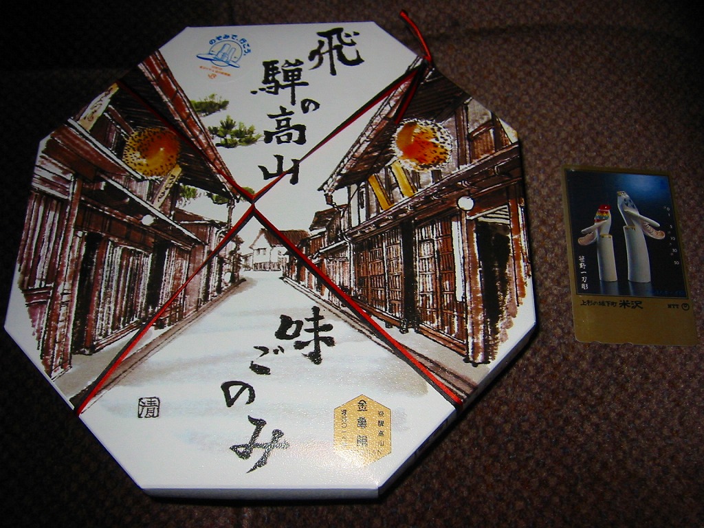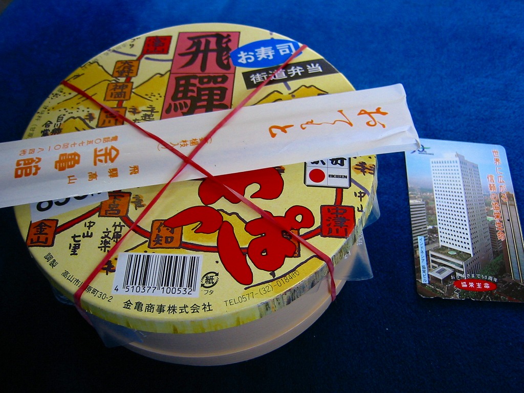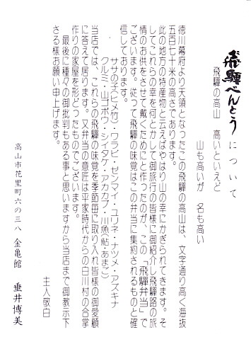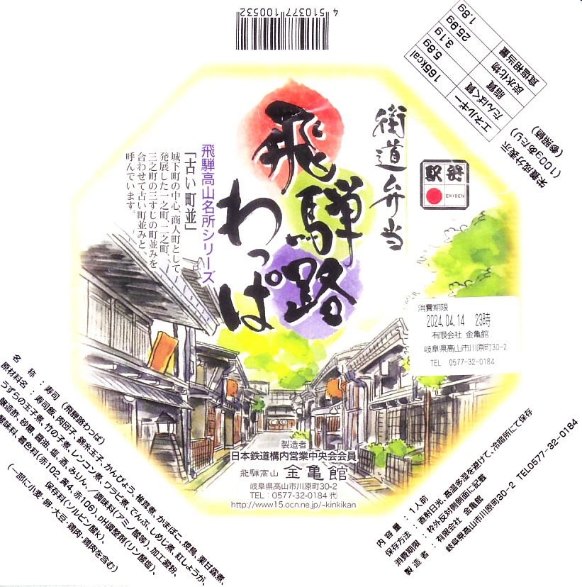経木枠の正八角形の容器に、高山の古い街並みを描いたボール紙のふたをかける。中身は俵飯に鯖塩焼・蒲鉾・卵焼きに海老や鶏唐揚にこもどうふやわらびなど、つまり正統な幕の内駅弁。中身のグレードの割に価格が高過ぎると感じた。また、これは駅弁屋から見れば仕方がないが、パッケージに高山を通らない新幹線のぞみ号の、高山と関係ない品川駅開業のシールが貼られていてデザインを害しているのは残念。価格は2003年の購入時で1,050円、2014年時点で1,100円、2023年時点で1,200円、2024年時点で1,300円。
