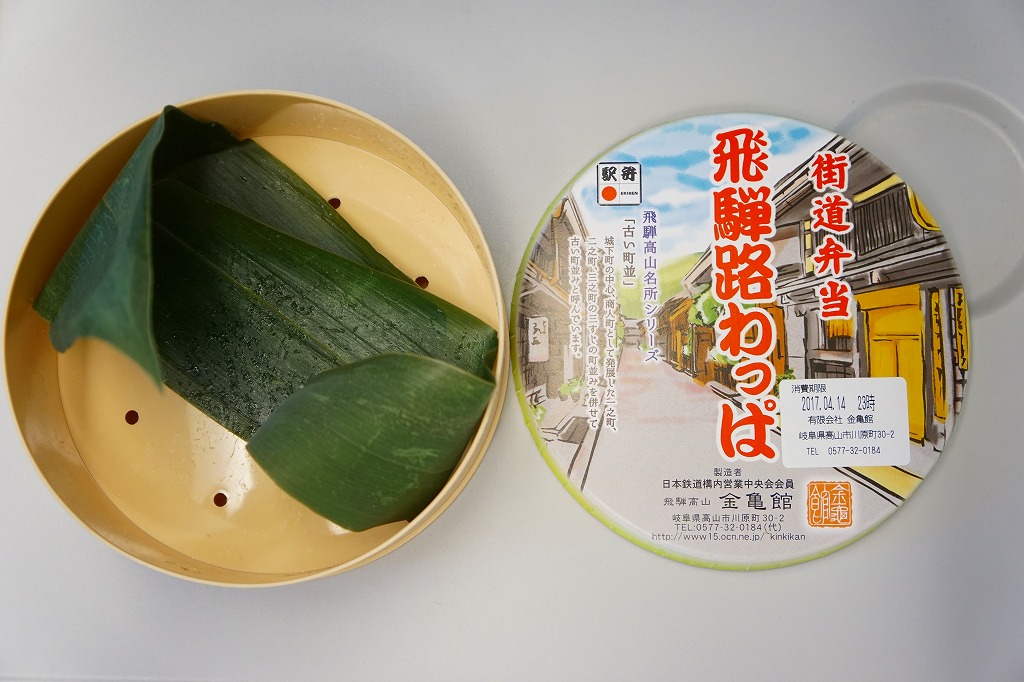 2017(平成29)年4月14日に購入した、高山駅弁のふた。当時は丸い容器にぴったりはまる、厚紙のふたが使われた。2022年に透明なふたと掛紙に変わり、2023年に掛紙の絵柄が上記の2024年のものになったらしい。容器と中身は変わらない。