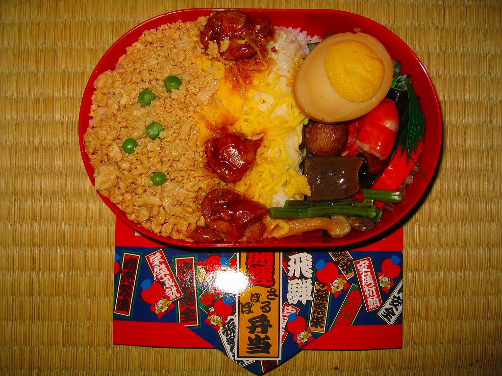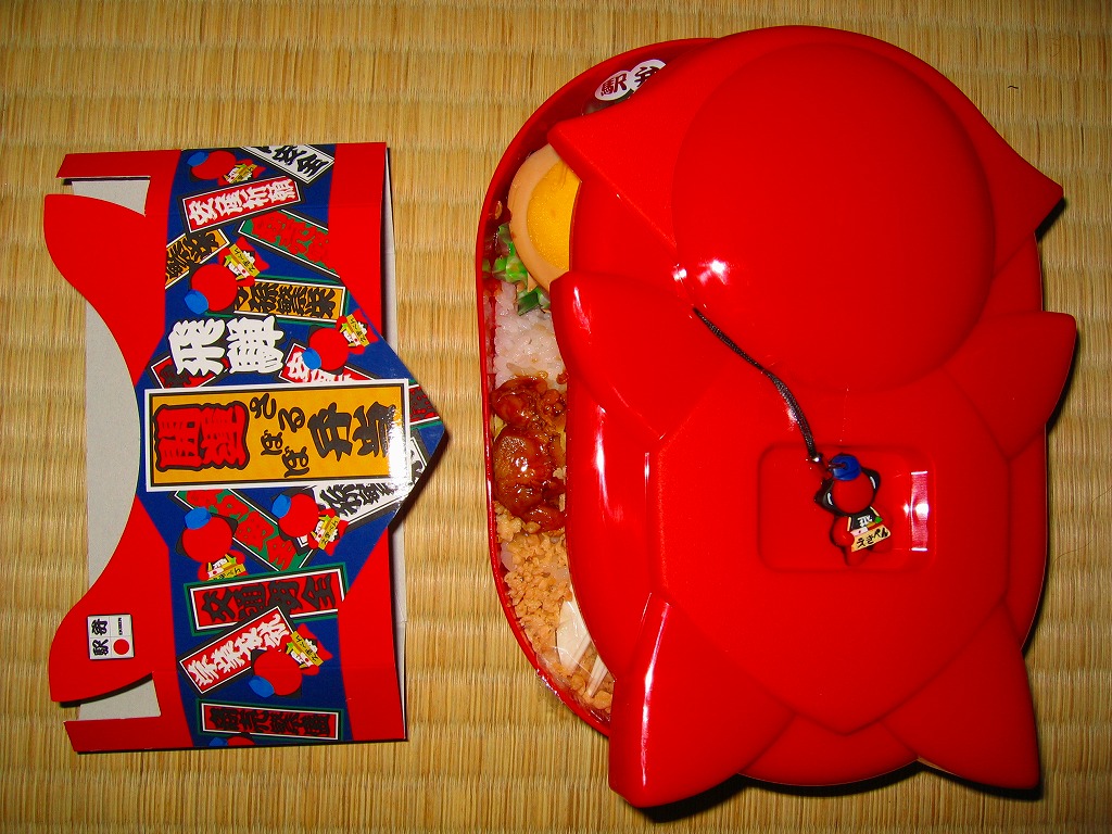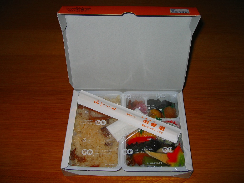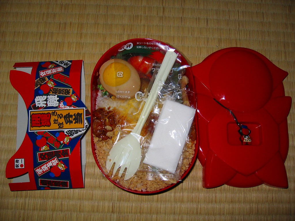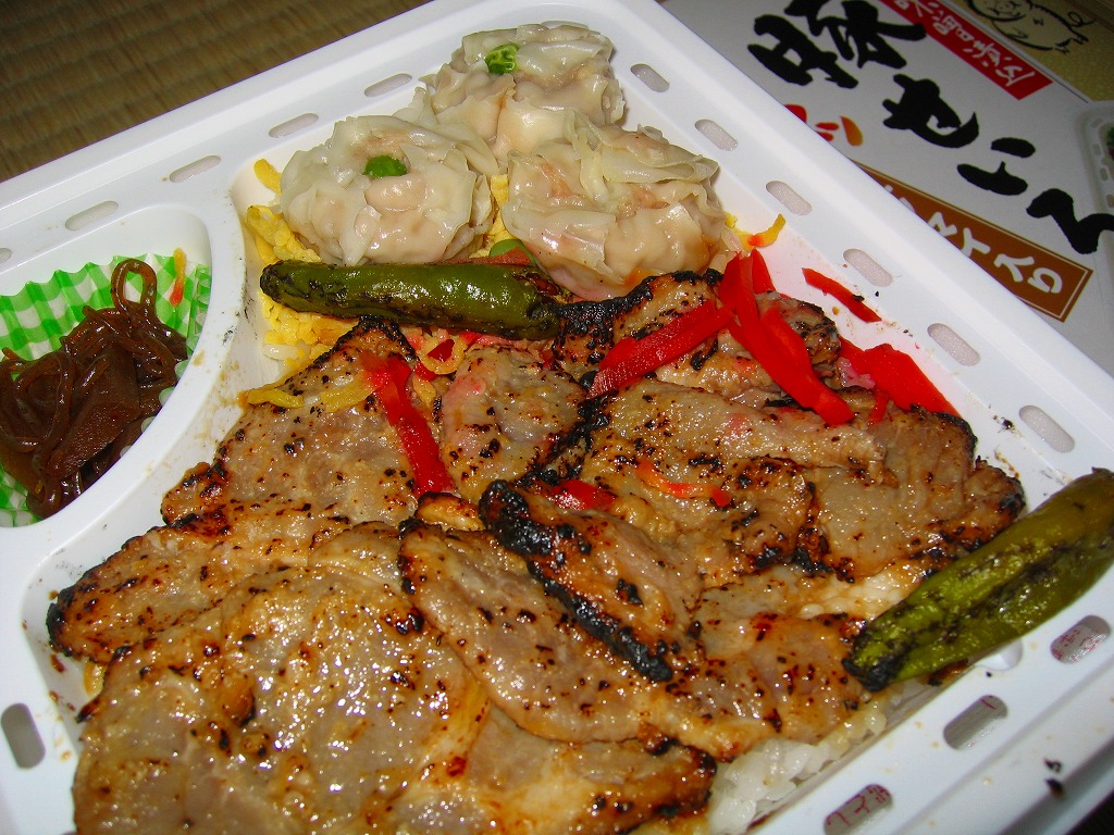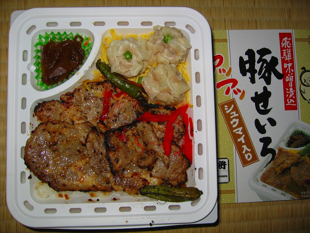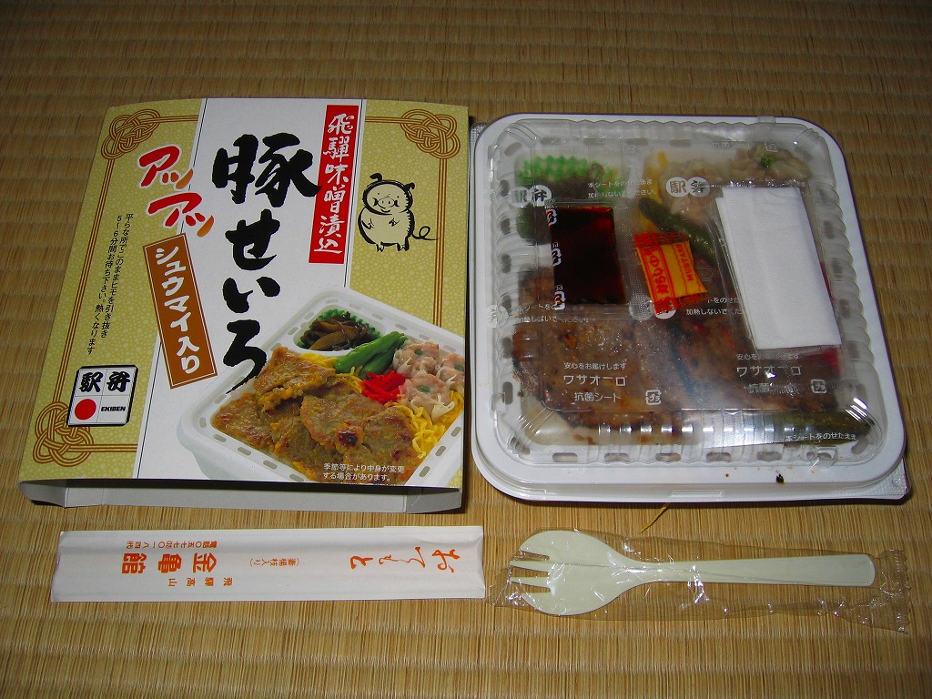2006(平成18)年10月に発売。正方形の加熱機能付き容器を、中身写真と駅弁の名前を書いたボール紙の枠にはめる。中身は白御飯の上を焦げ目のある豚肉味噌漬と豚焼売で覆い、ししとうと紅生姜を載せてこんにゃくごぼうを添えるもの。中身に着色料と刺激臭を提供してしまった紅生姜が別添であれば、見栄えや風味や分量や品質について文句なし。現存しない模様。